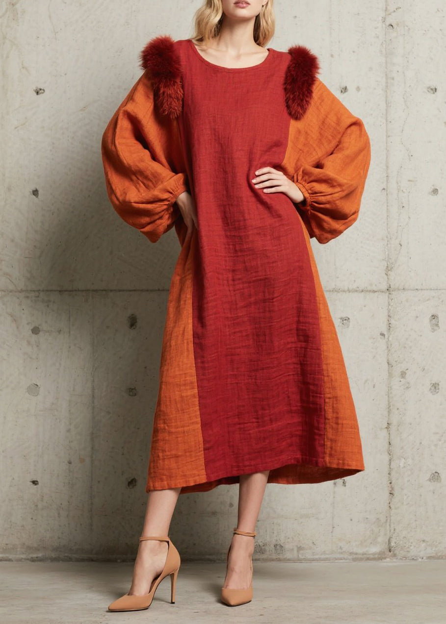Women Red Oversized Patchwork Faux Fur Maxi Dress Fall