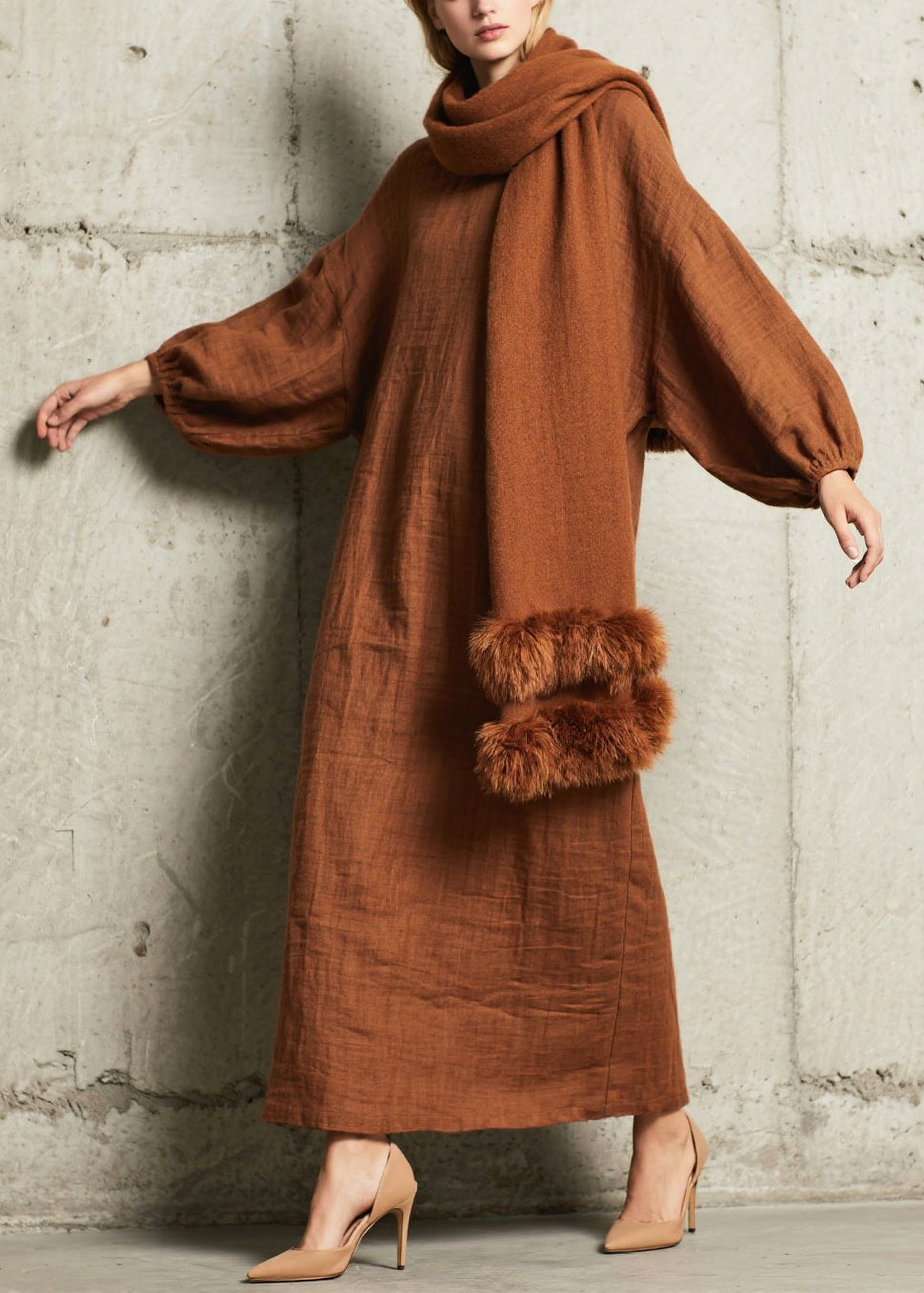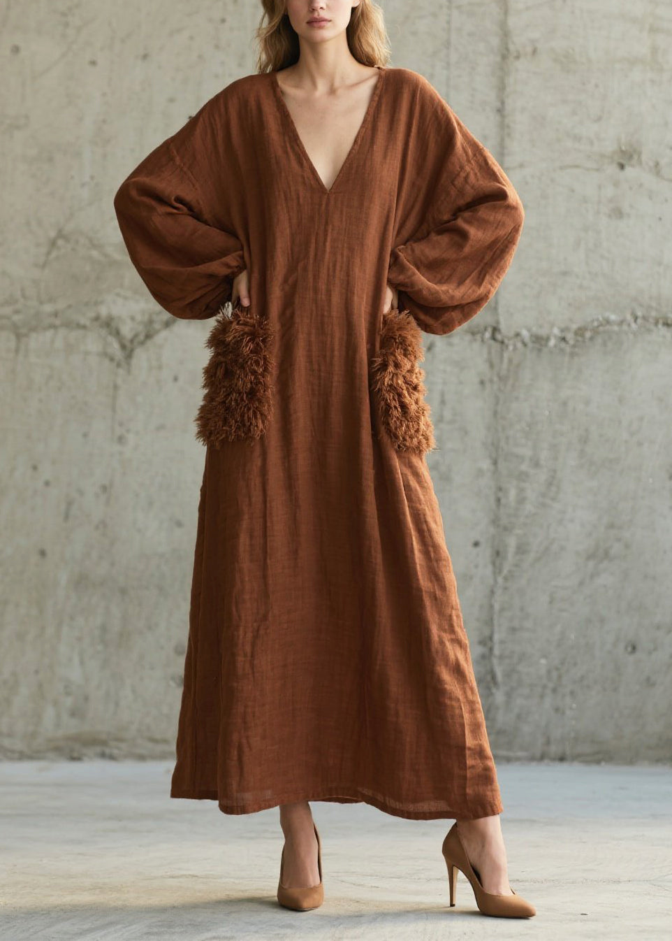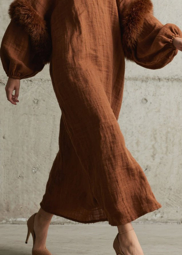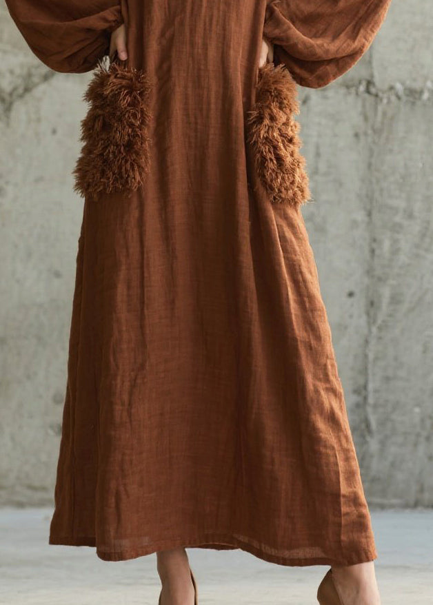 Elegant Brown Oversized Cotton Long Dresses Lantern Sleeve