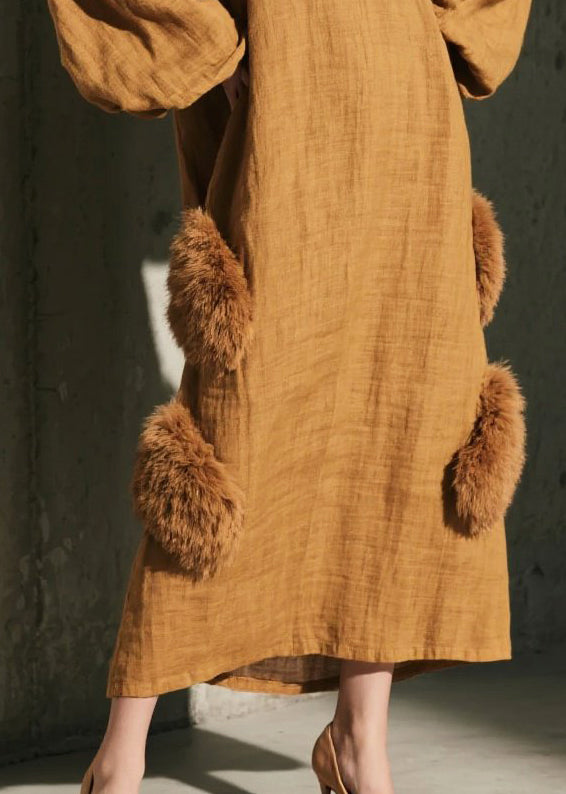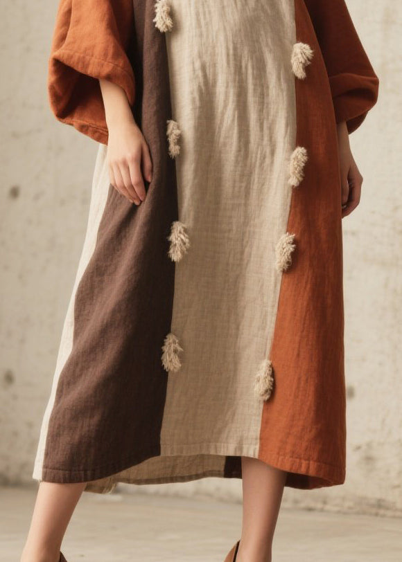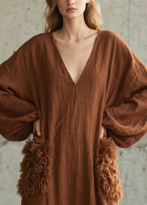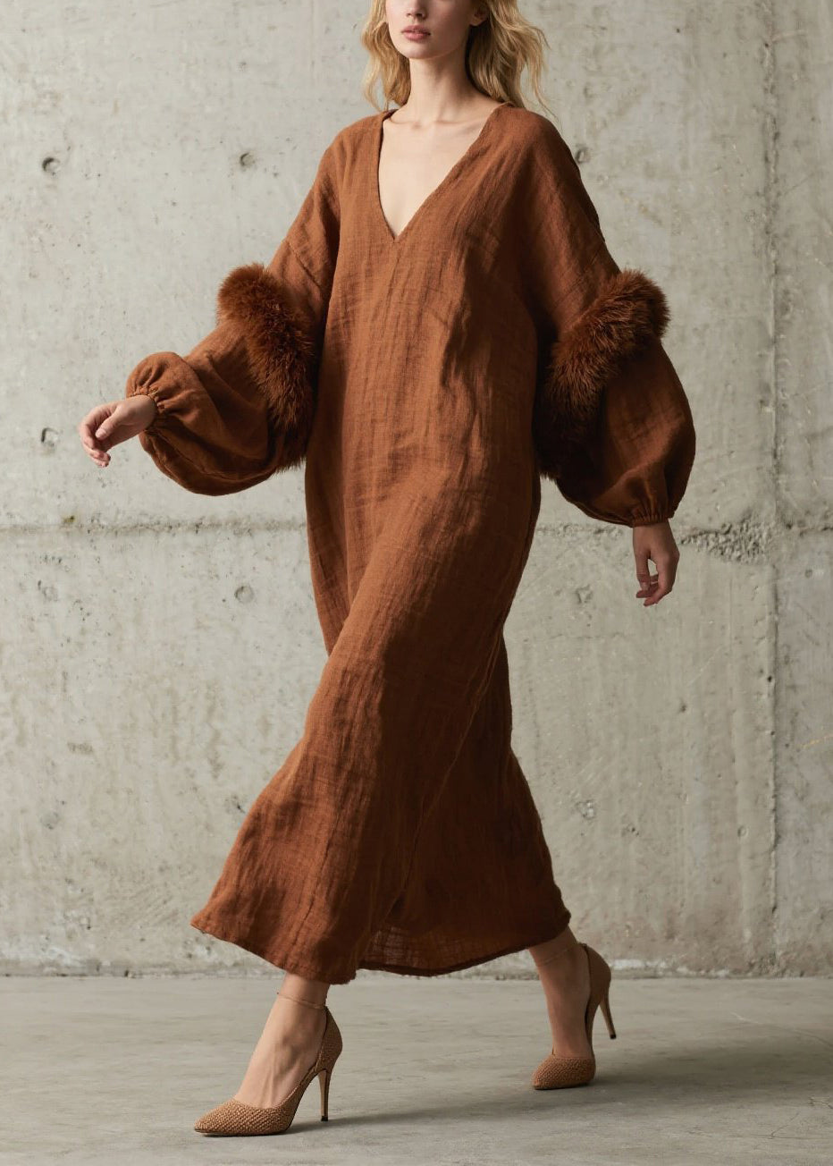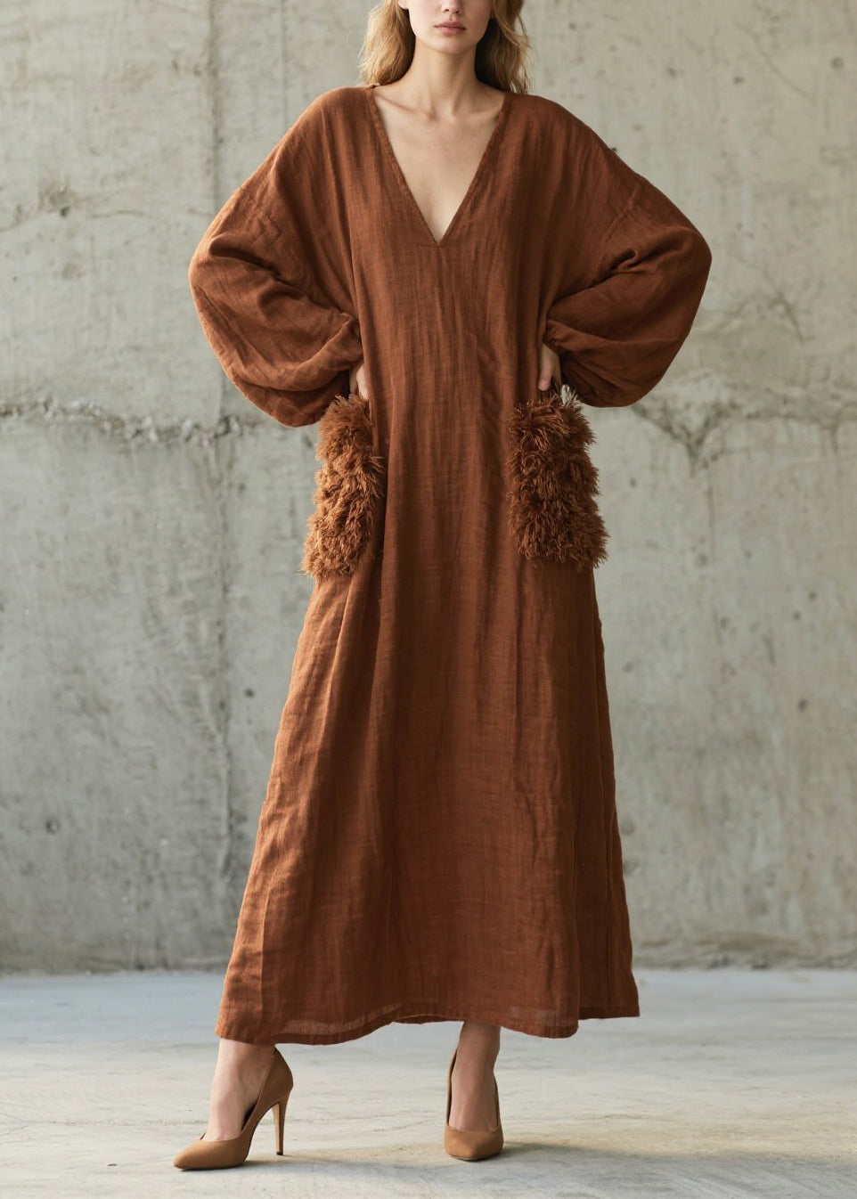 Elegant Brown Oversized Cotton Long Dresses Lantern Sleeve