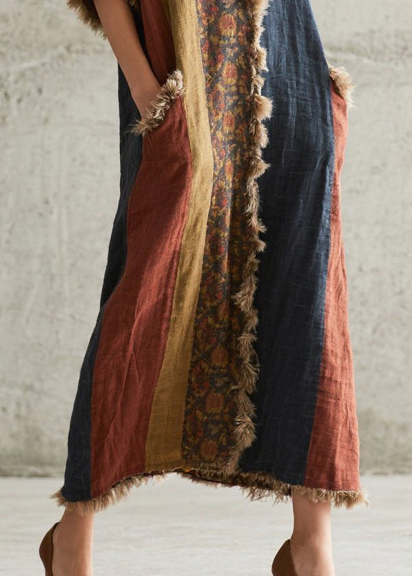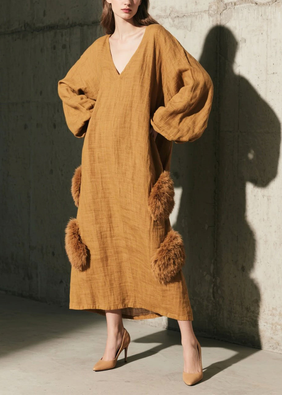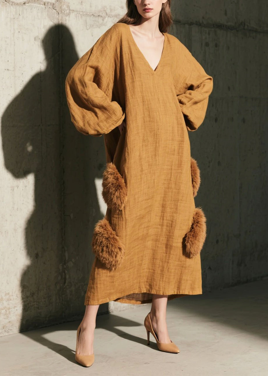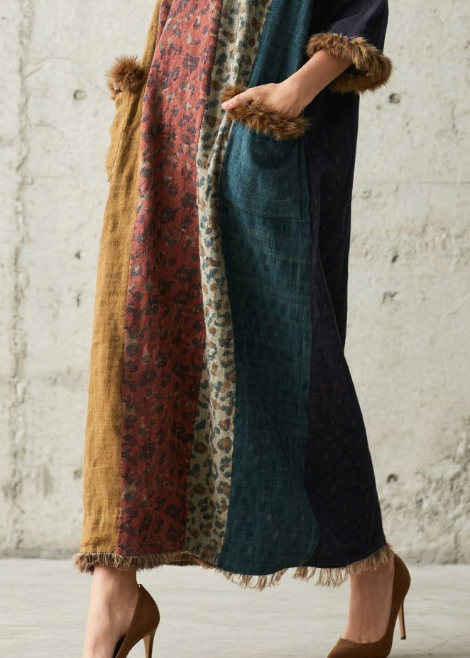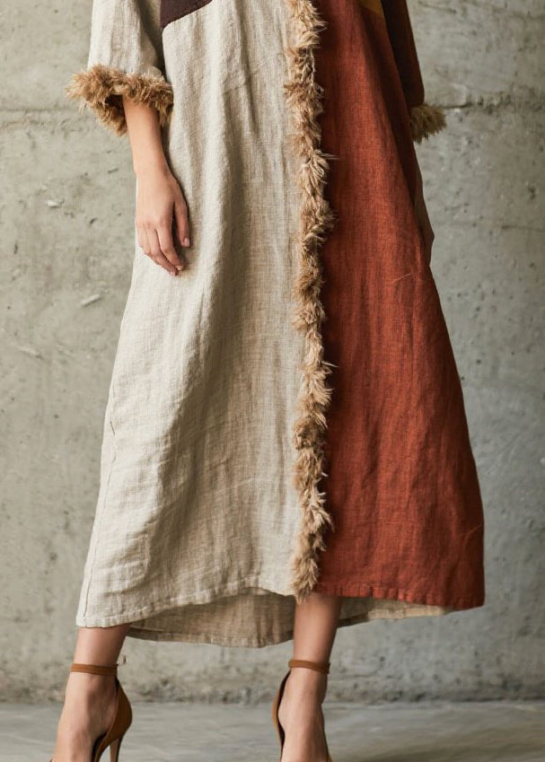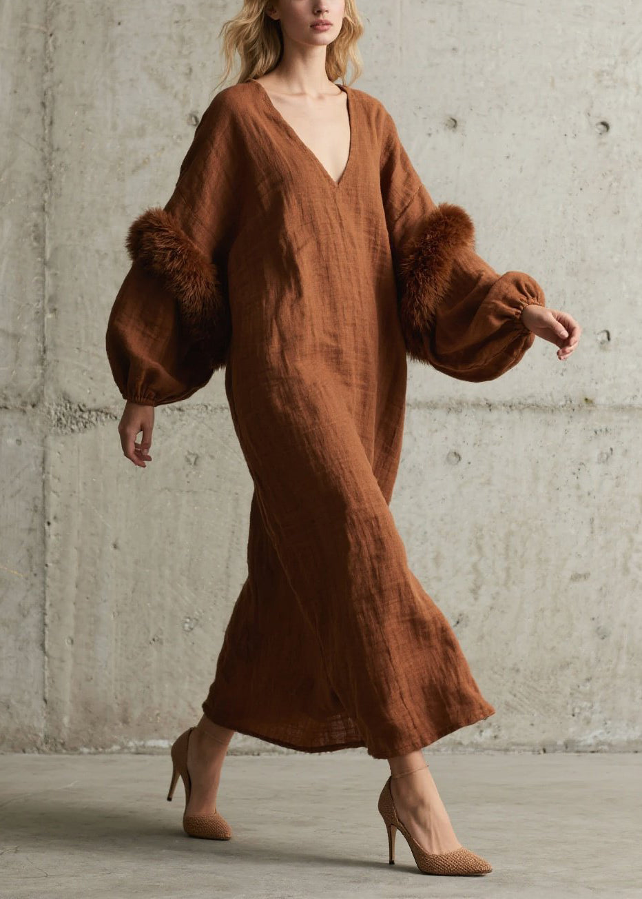 Handmade Brown V Neck Patchwork Faux Fur Maxi Dresses Fall
