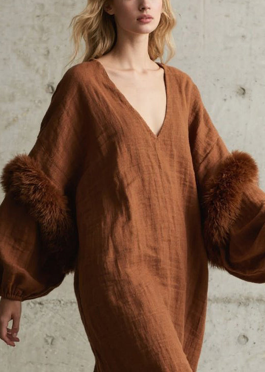 Modern Brown V Neck Patchwork Faux Fur Vacation Dresses Lantern Sleeve