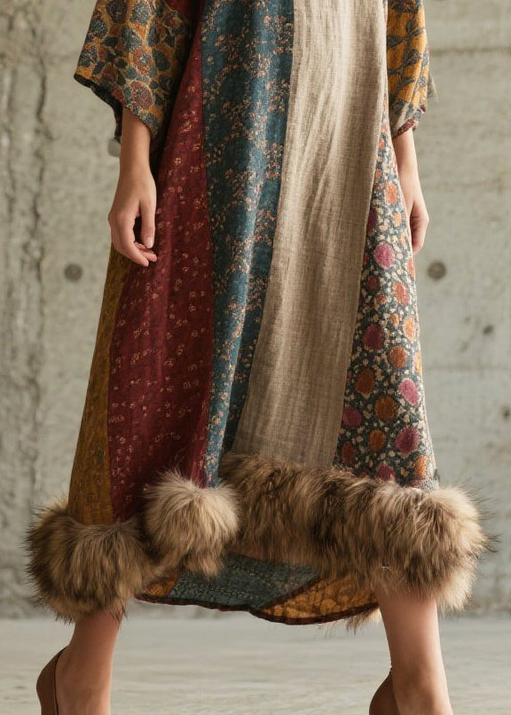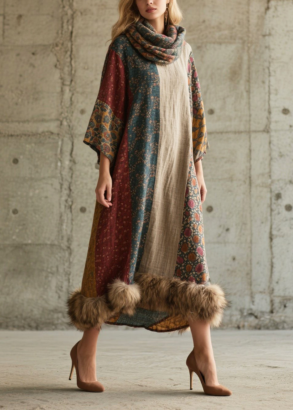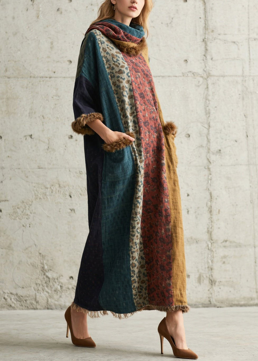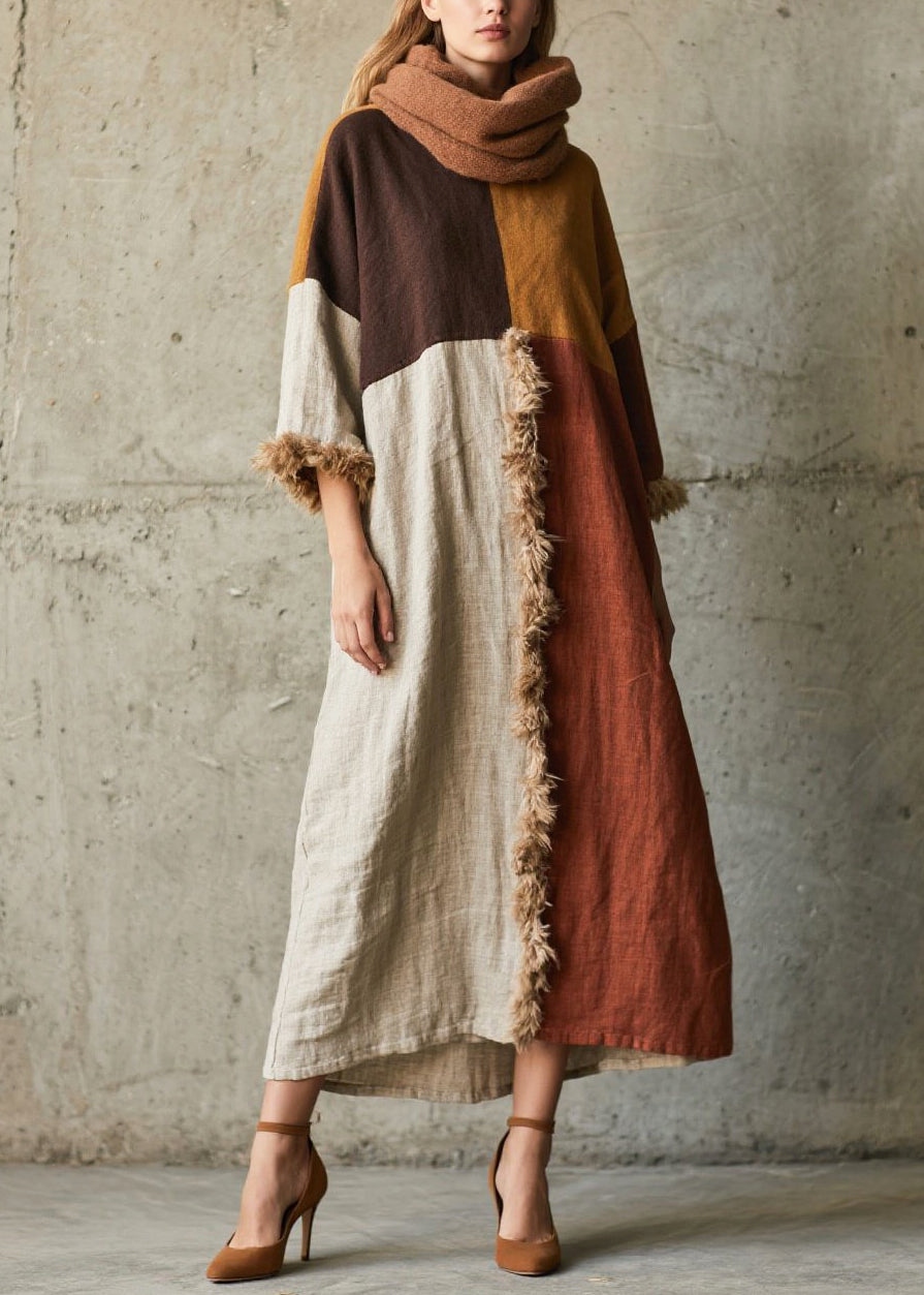 Organic Colorblock Oversized Patchwork Faux Fur Ankle Dress Fall