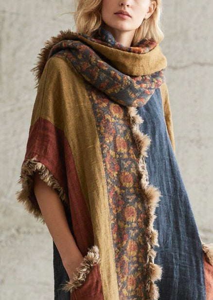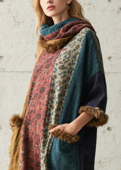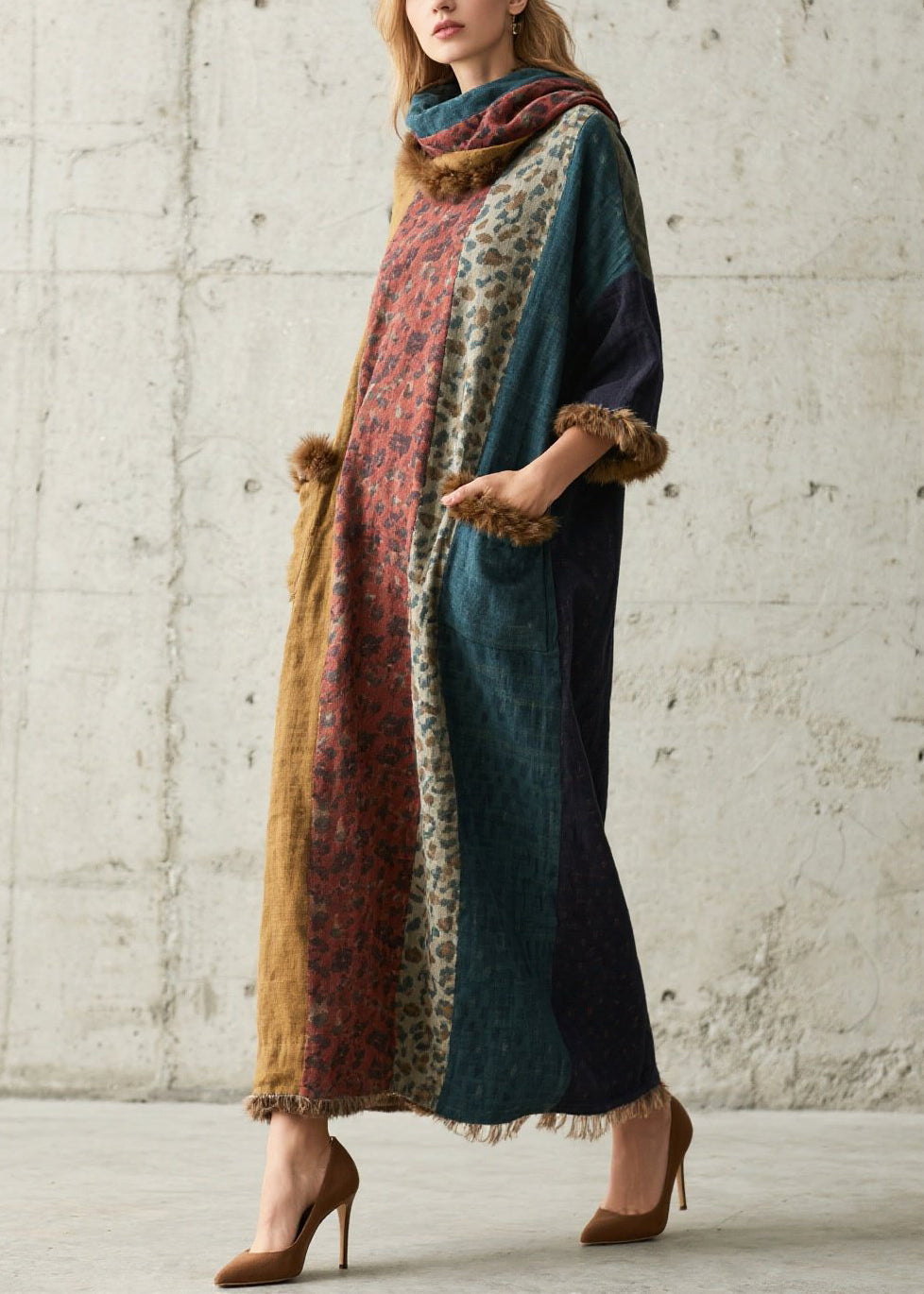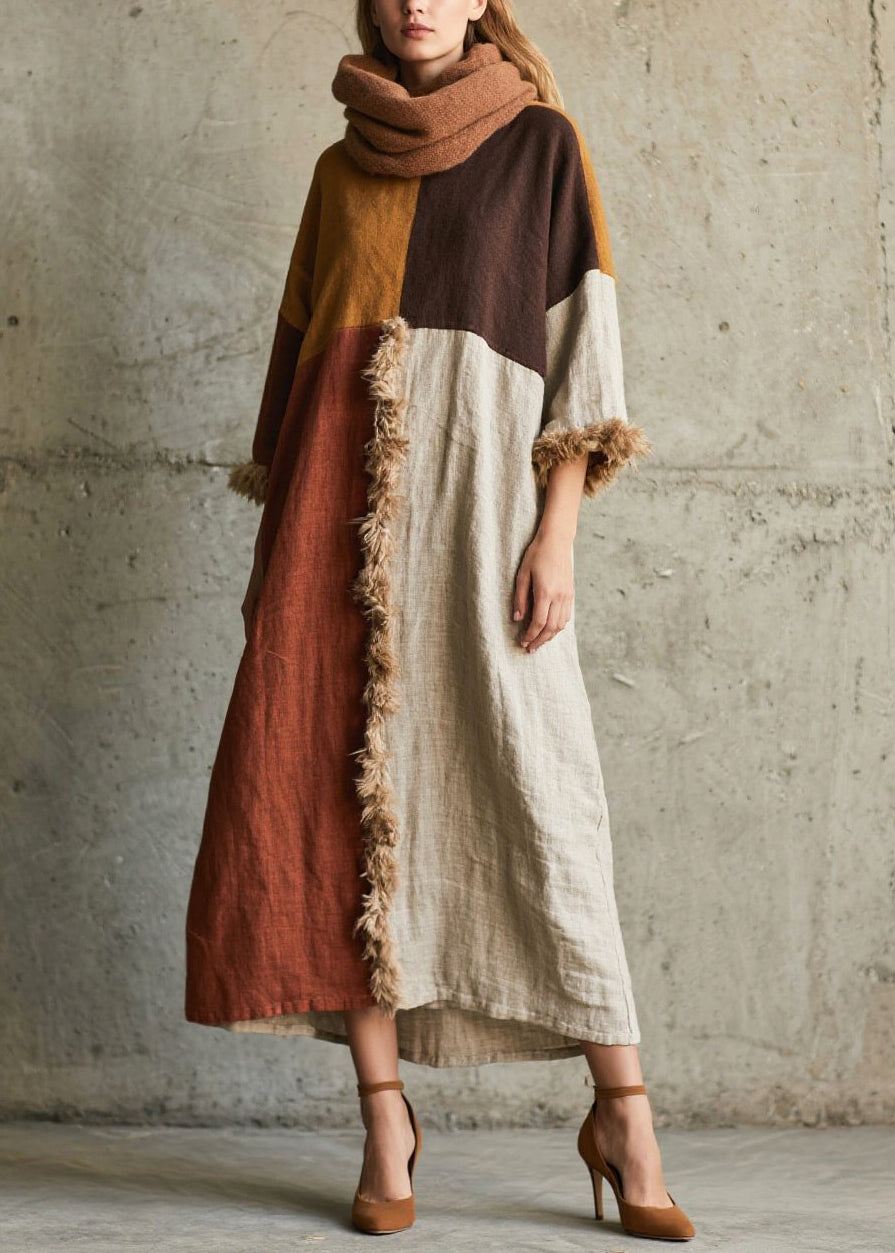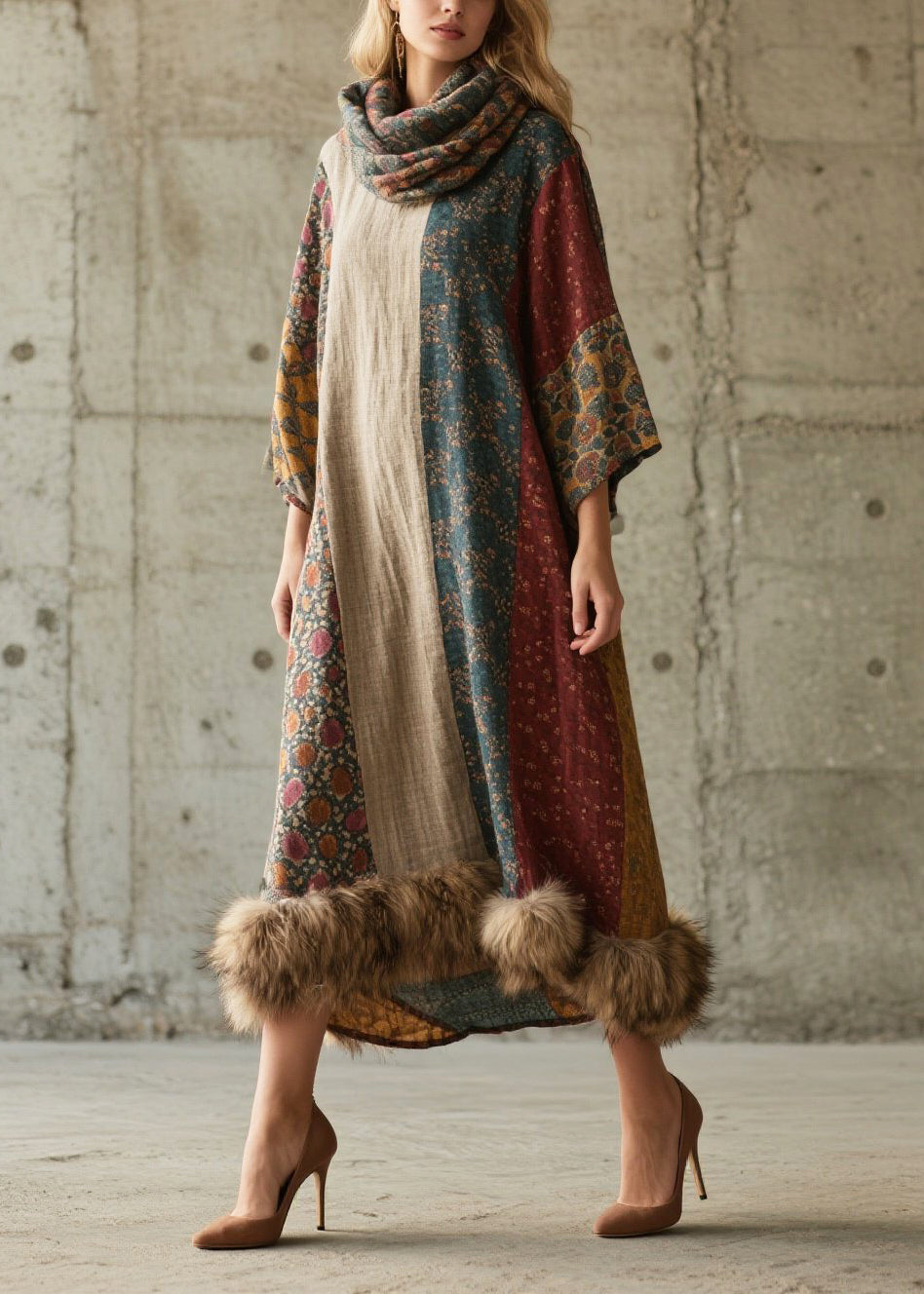 Organic Colorblock Oversized Patchwork Faux Fur Ankle Dress Fall