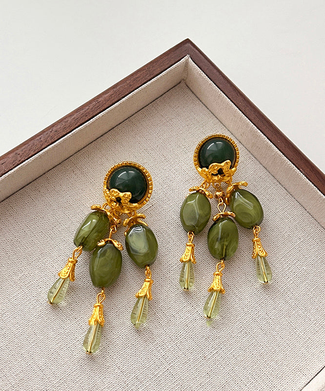 Chinese Style Green Alloy Jade Tassel Drop Earrings