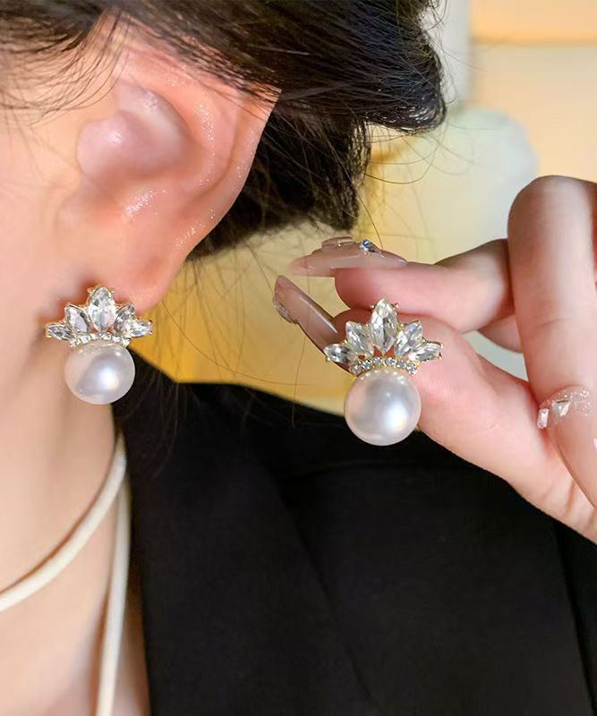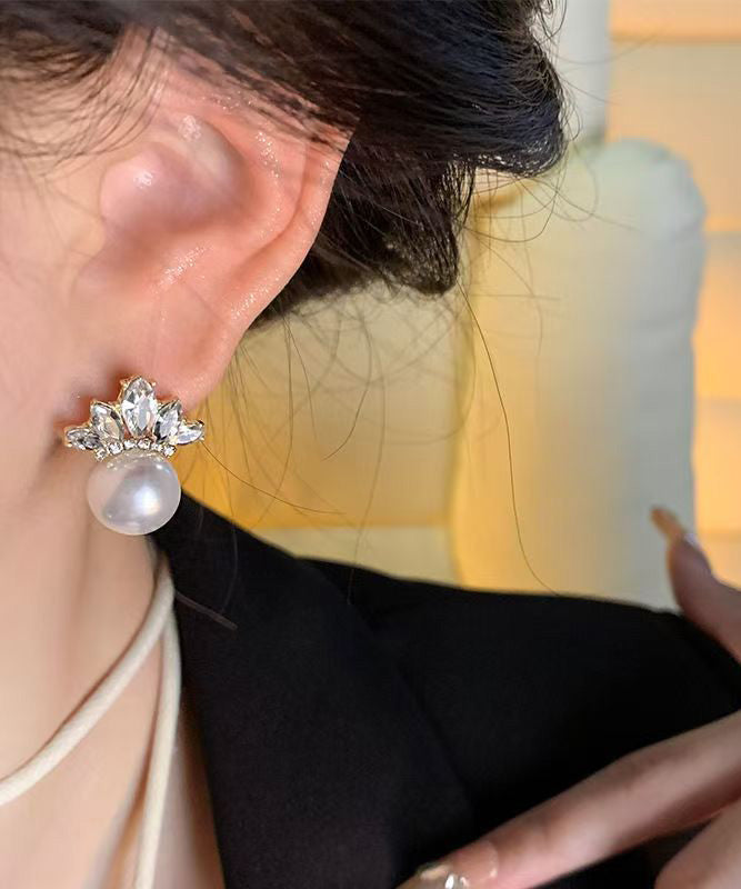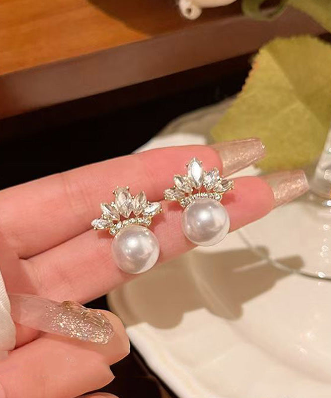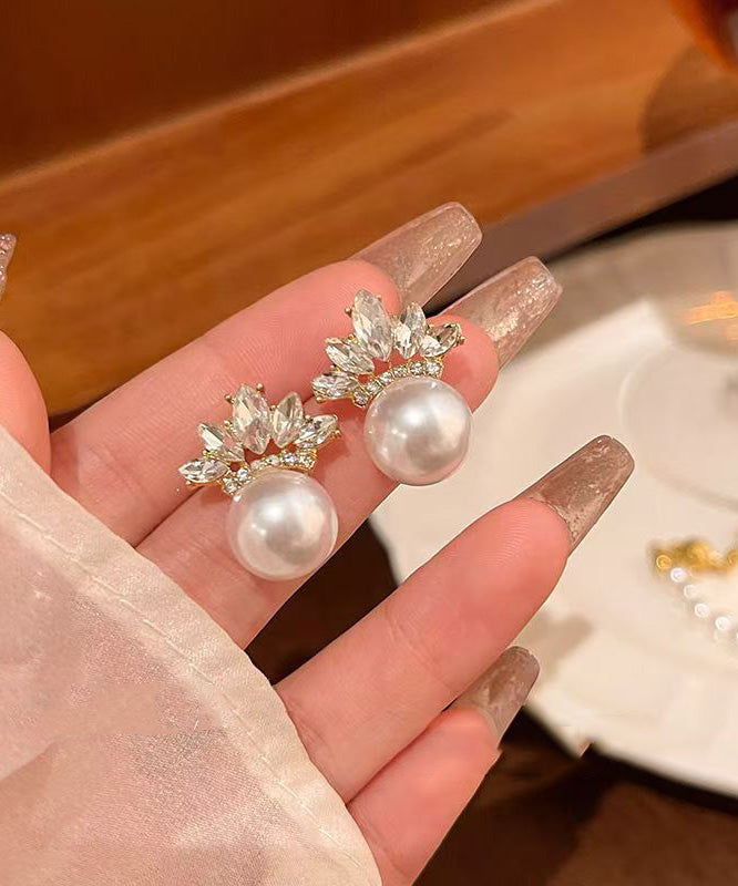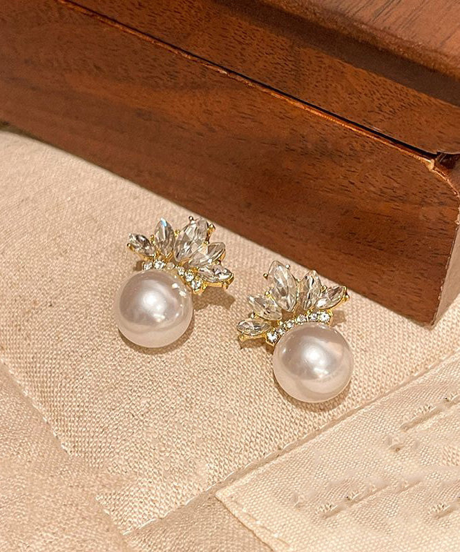 Fashion Gold Copper Alloy Zircon Leaf Pearl Stud Earrings