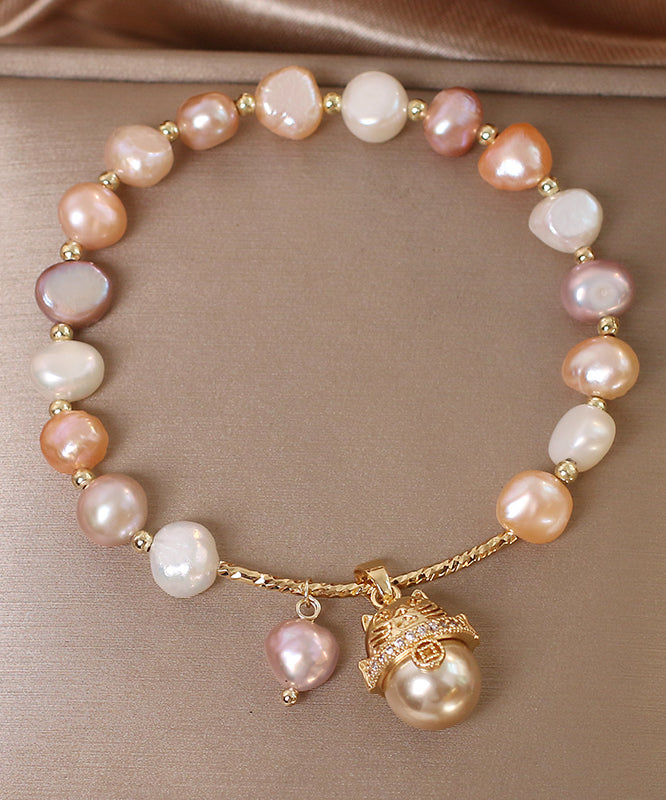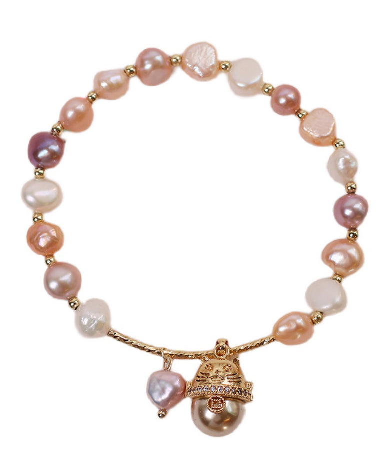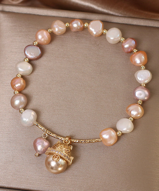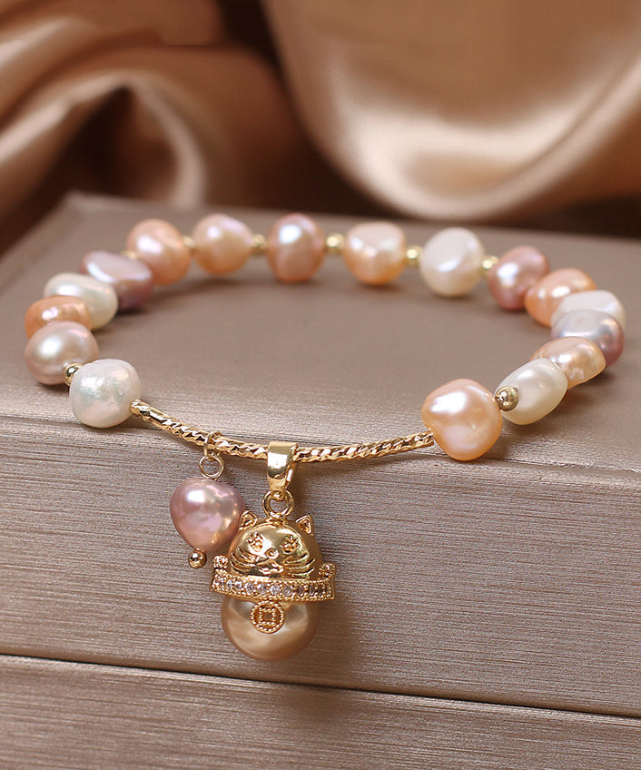 Original Design Champagne Copper Overgild Pearl Lucky Cat Tassel Charm Bracelet