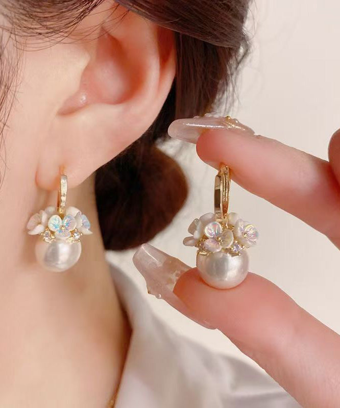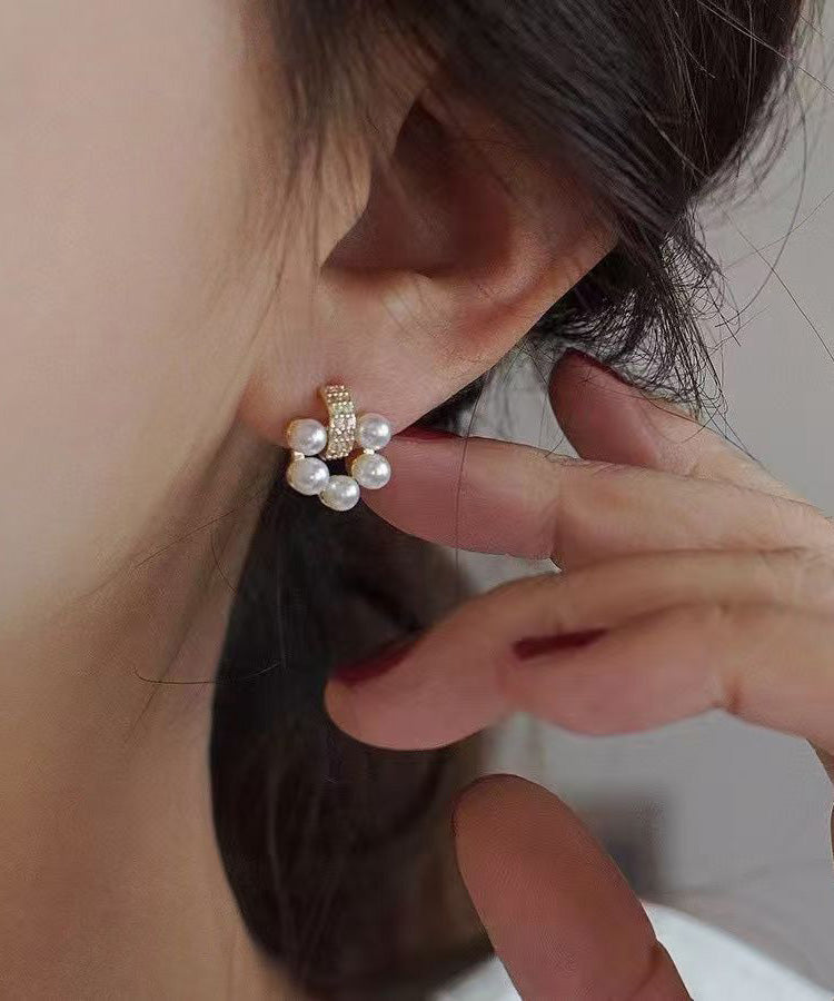 2025 New Gold Copper Alloy Zircon Pearl Floral Hoop Earrings