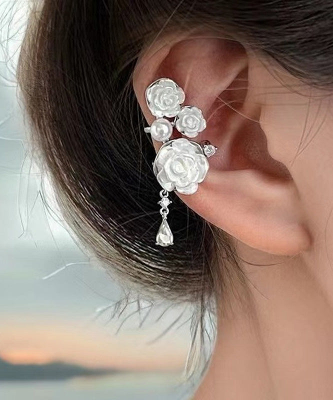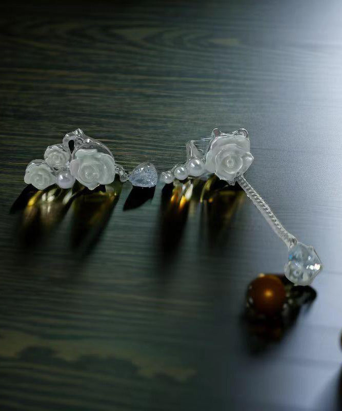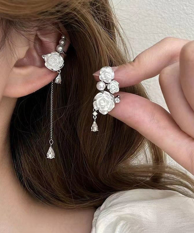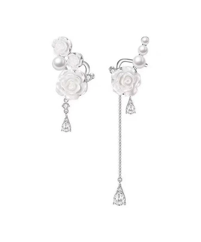 DIY White Copper Zircon Asymmetrical Rose Pearl Tassel Drop Earrings