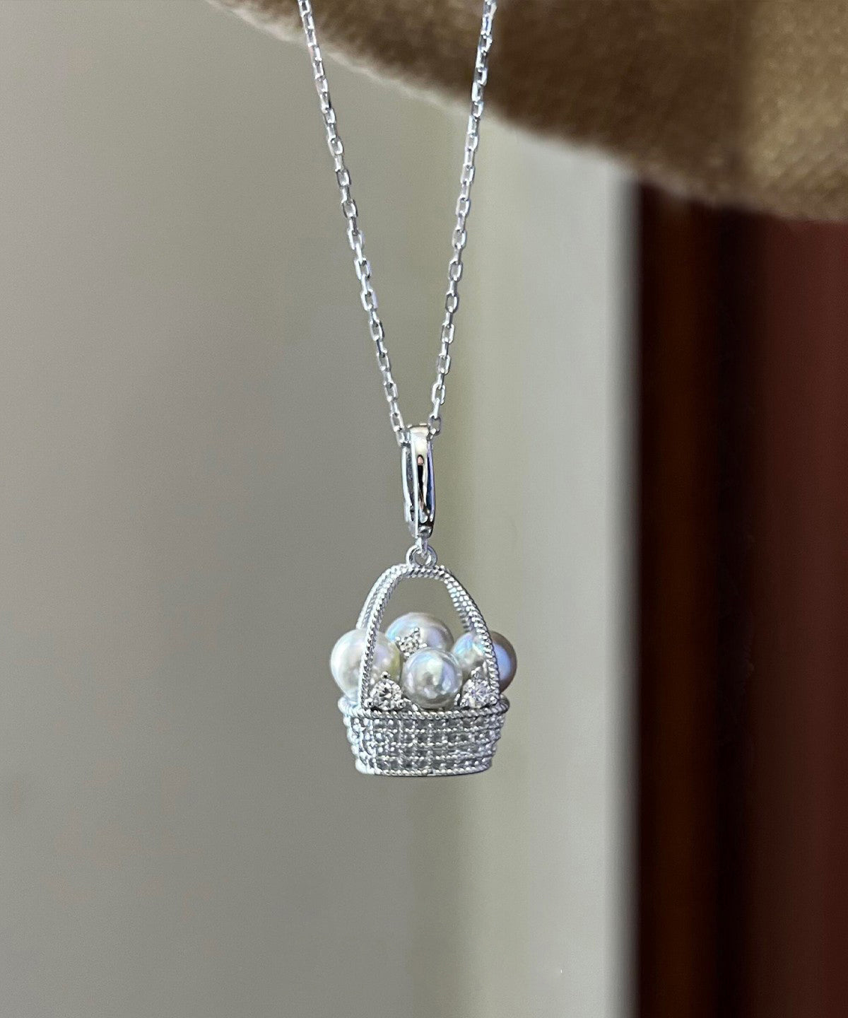 Original Design Silk Sterling Silver Zircon Pearl Flower Basket Pendant Necklace