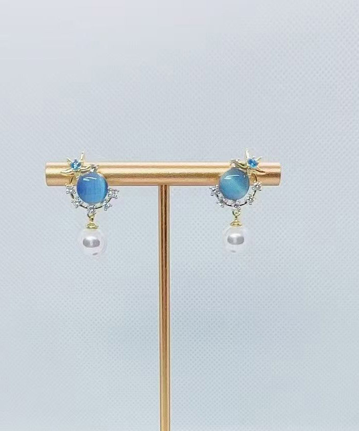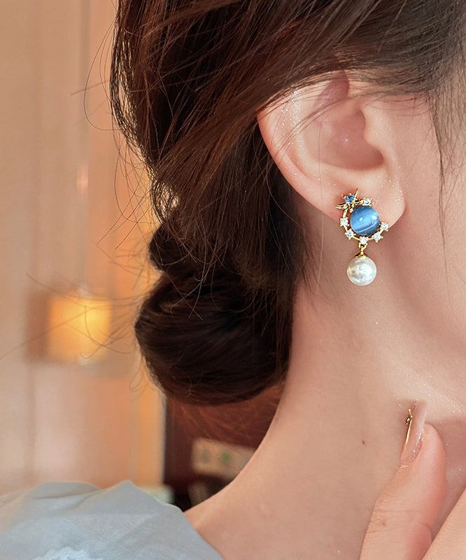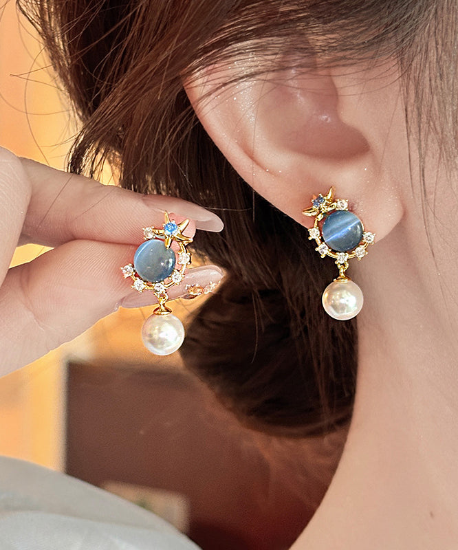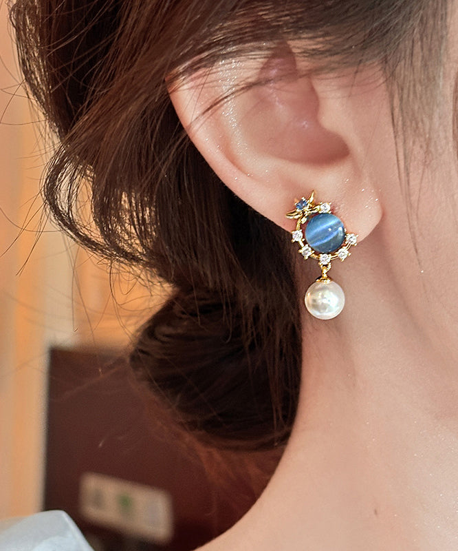 Vogue Blue Copper Overgild Zircon Pearl Cat's Eye Stone Drop Earrings