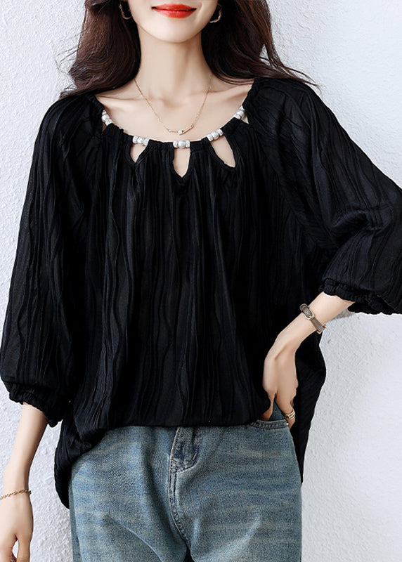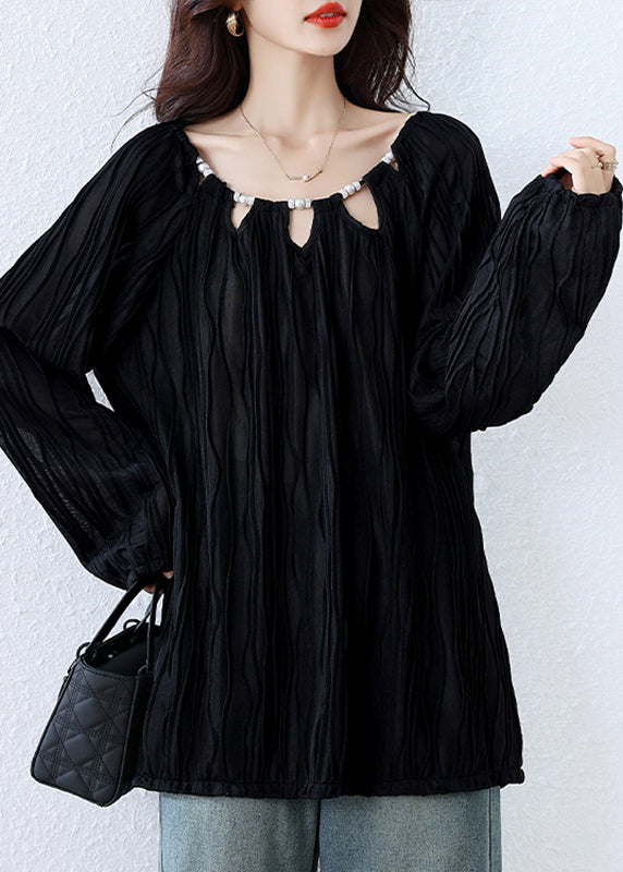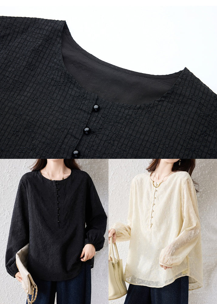 Fine Black O-Neck Nail Bead Cotton Loose Shirts Fall
