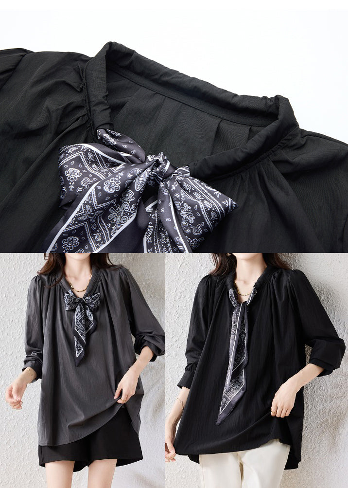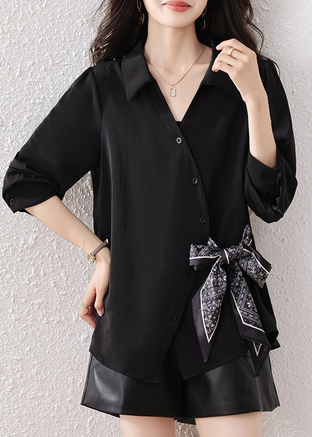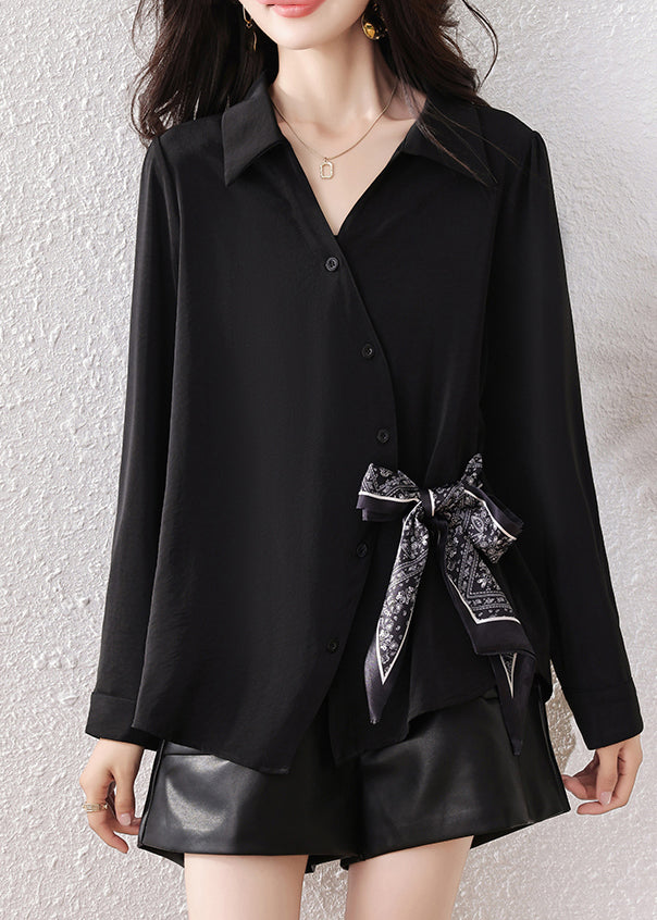 Boutique Black Scarf Tie Waist Cotton Shirts Fall