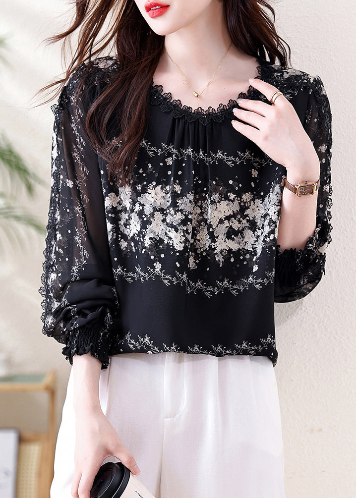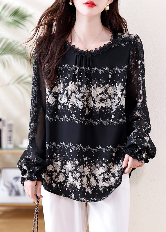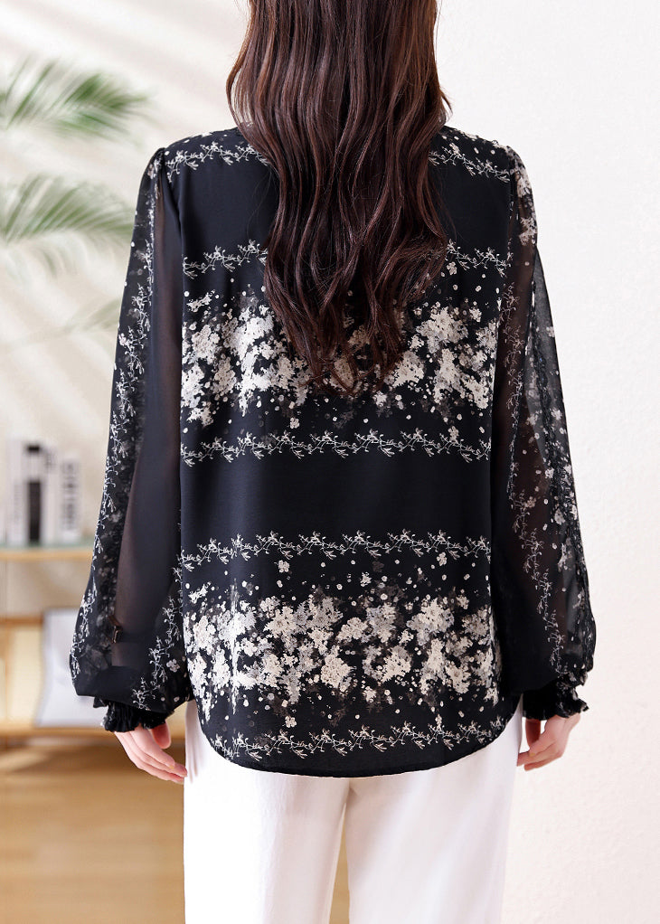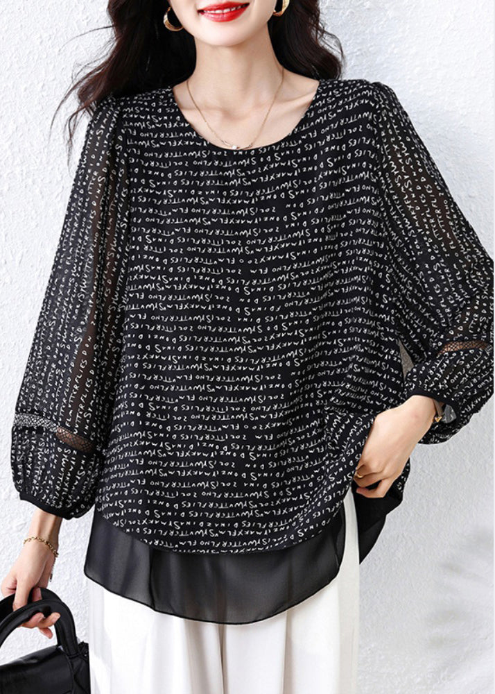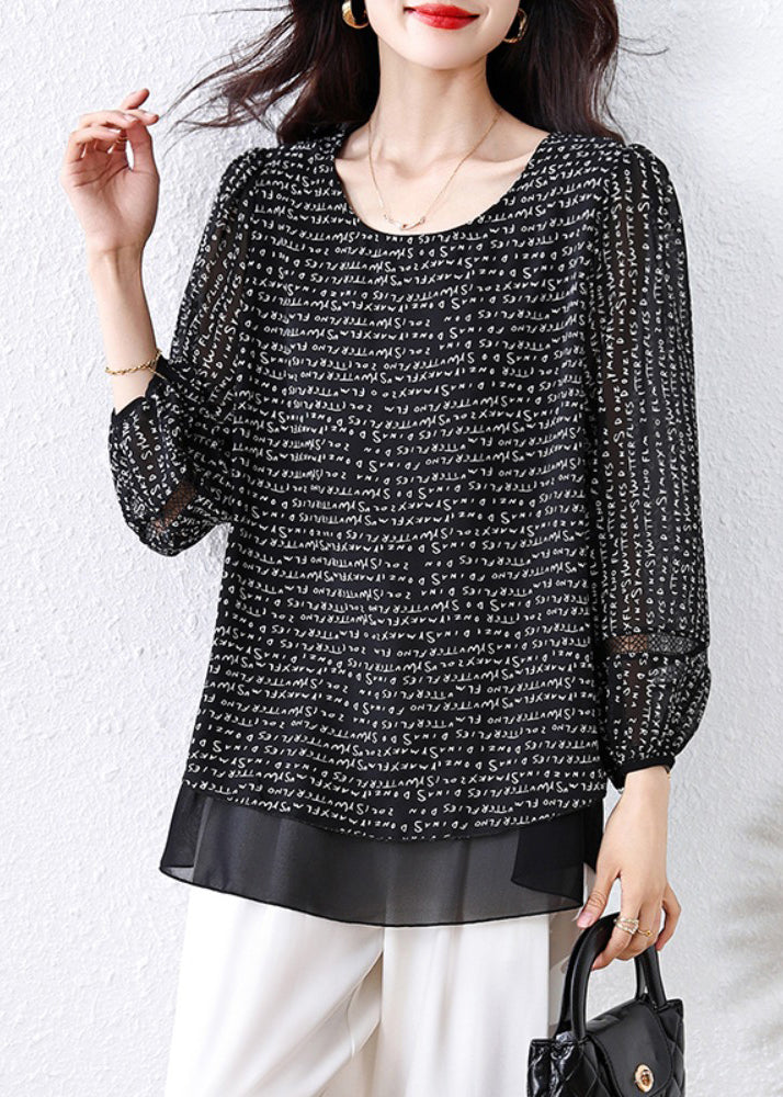 Classy Black Oversized Print Chiffon Fake Two Piece Shirts Fall
