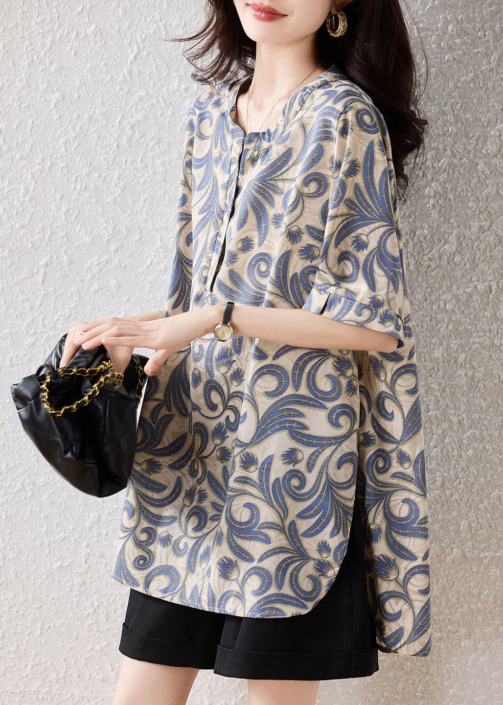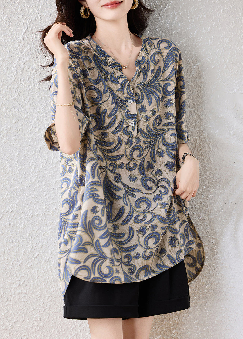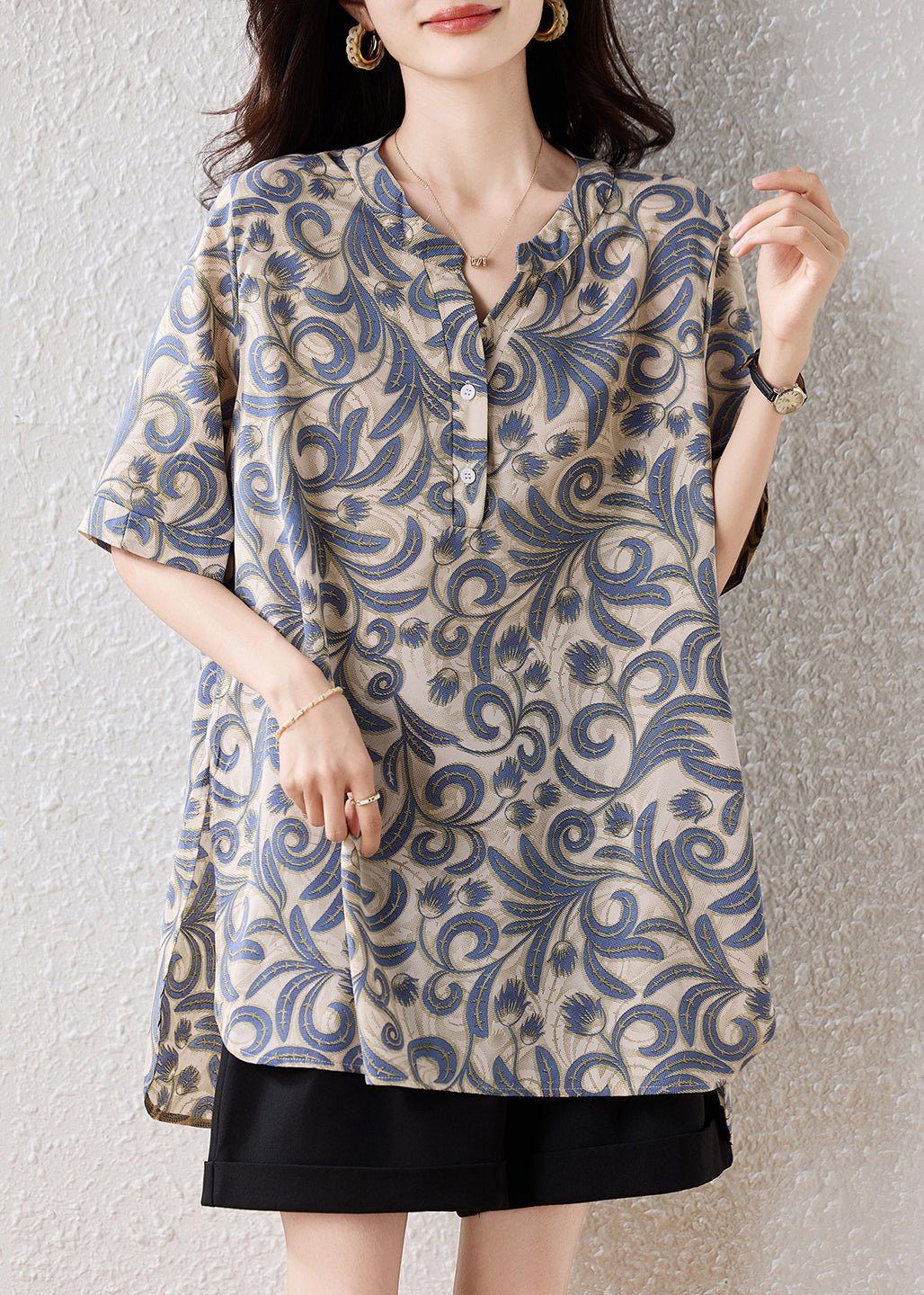 Casual Khaki Oversized Print Cotton Blouses Summer