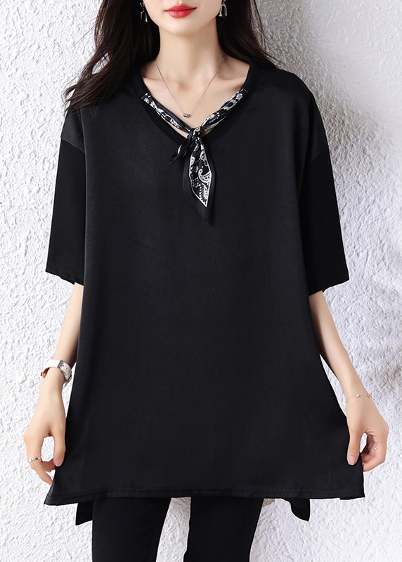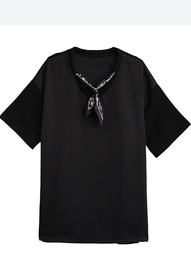 Classy Black Oversized Drawstring Scarf Cotton Long Tops Half Sleeve