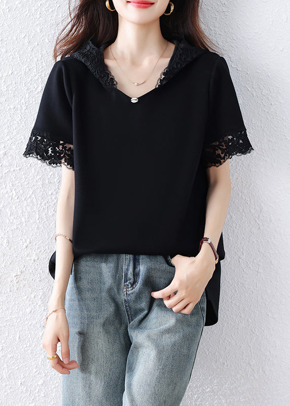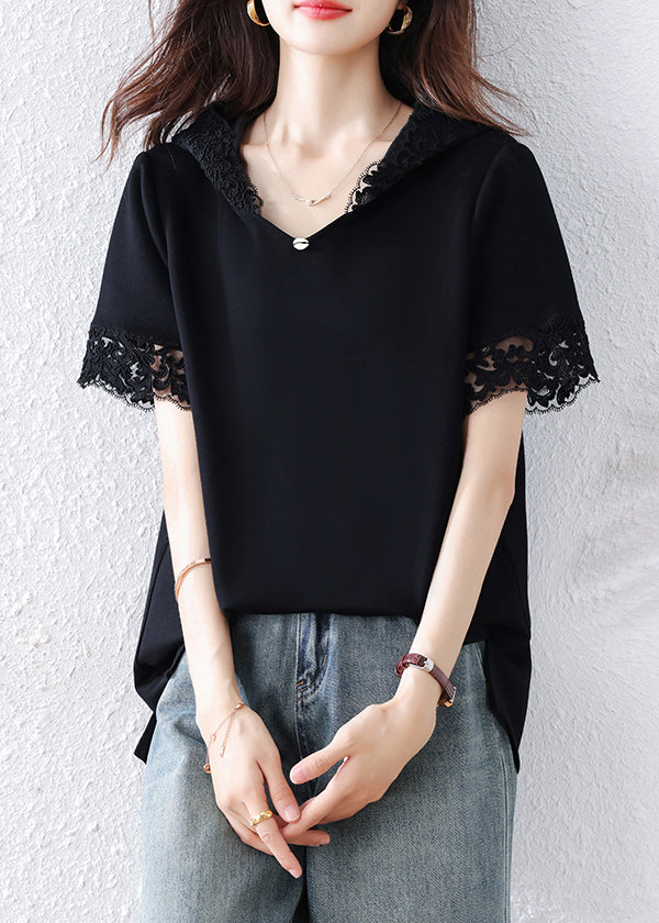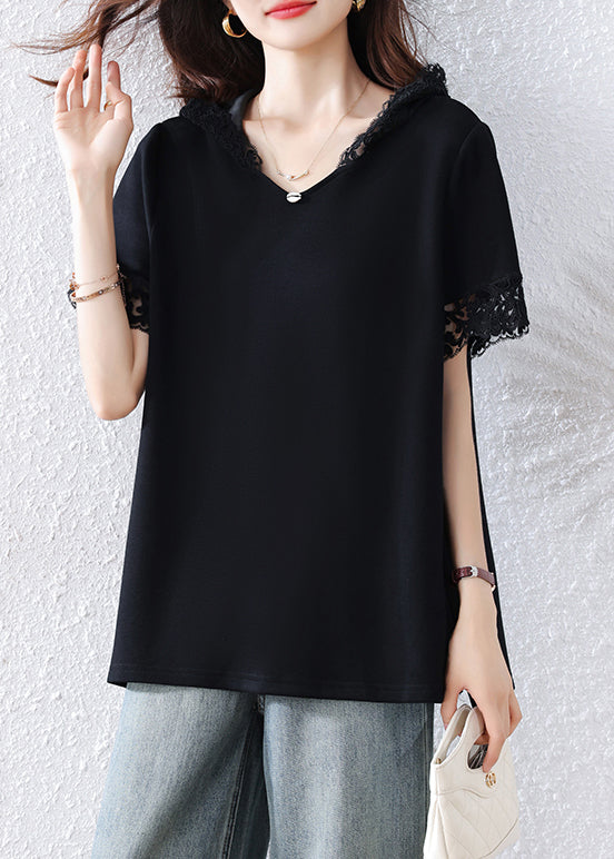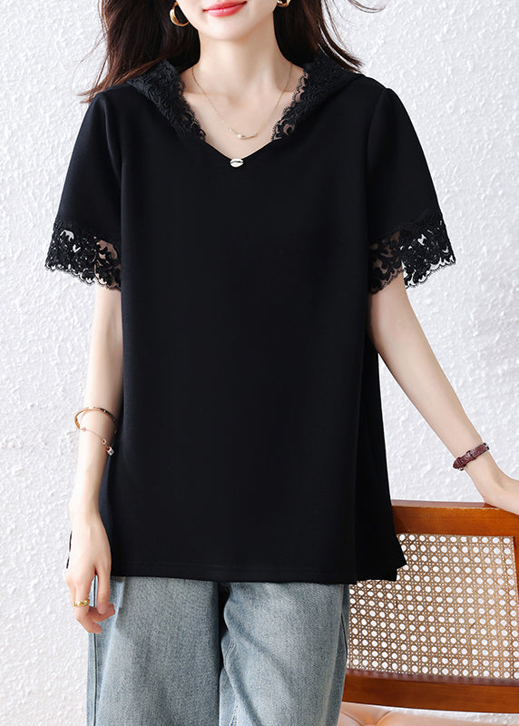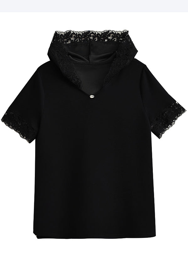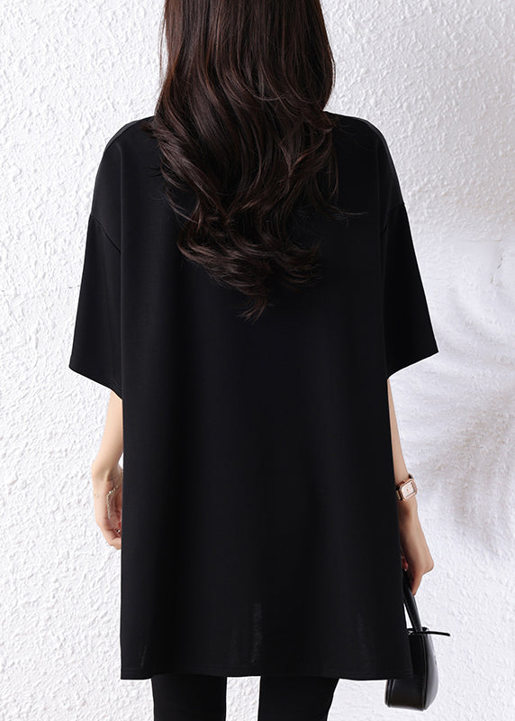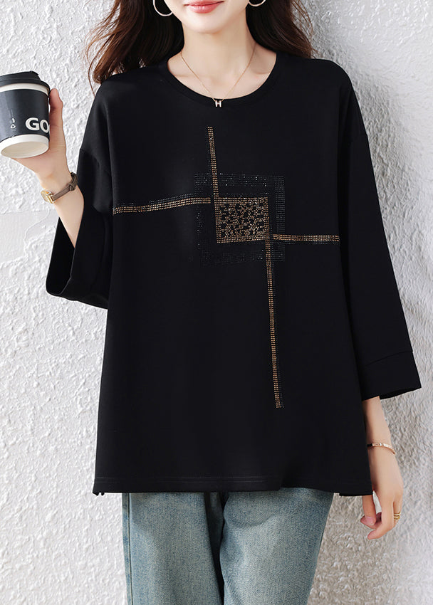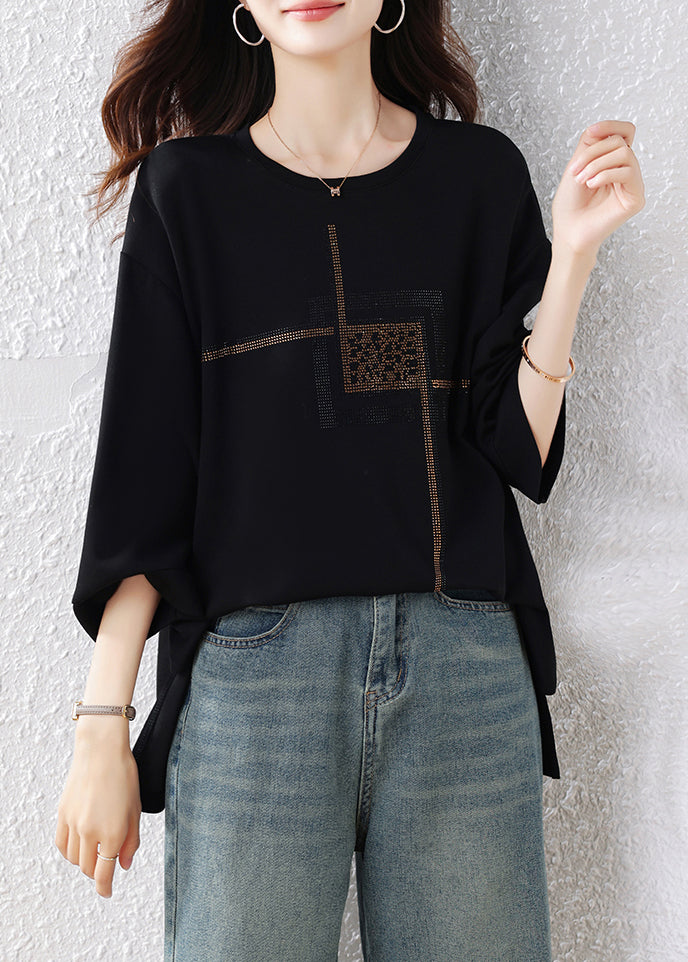 Fine Black Oversized Floral Rhinestone Cotton Tops Summer