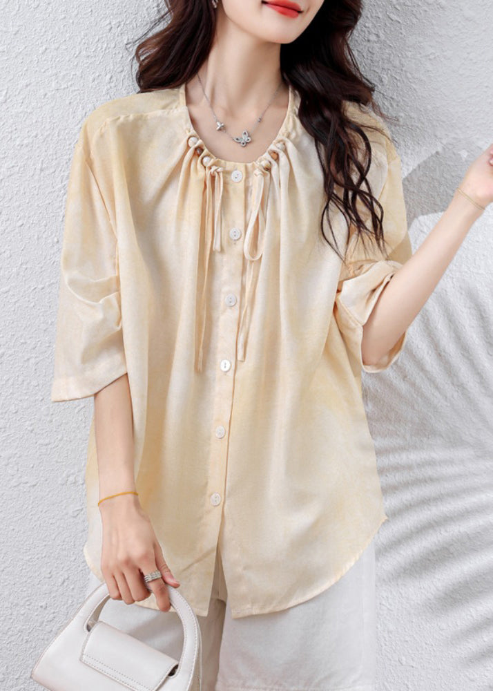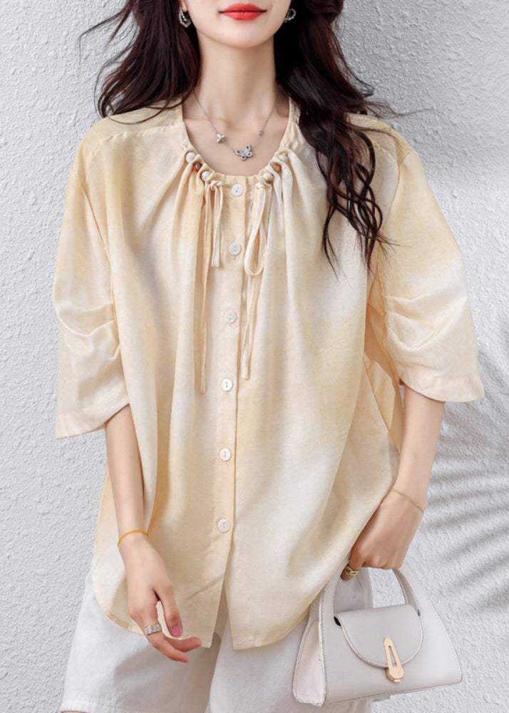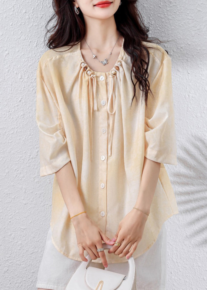 Elegant Apricot Drawstring Nail Bead Cotton Blouse Top Half Sleeve