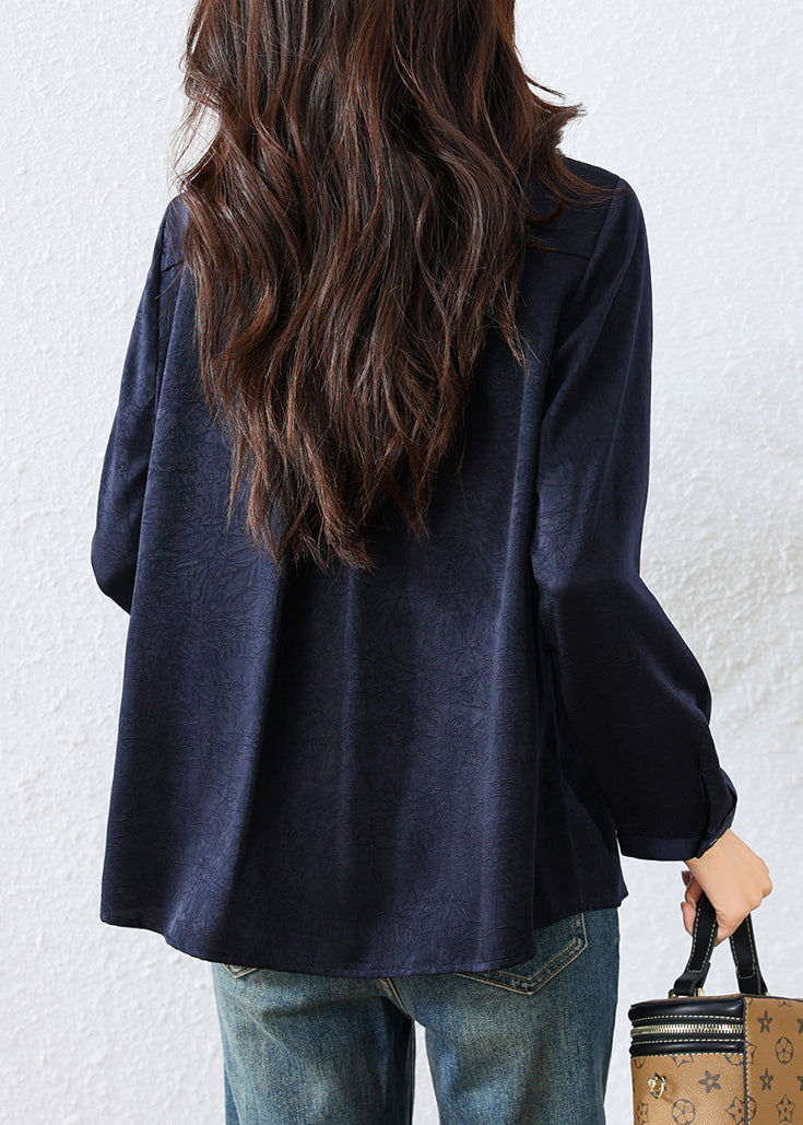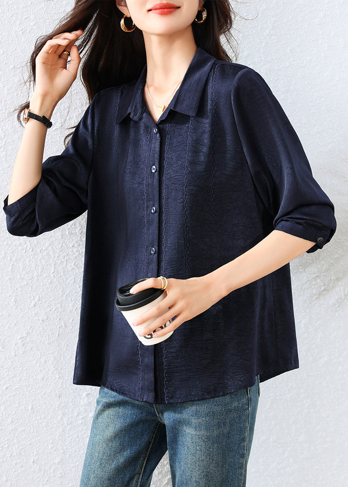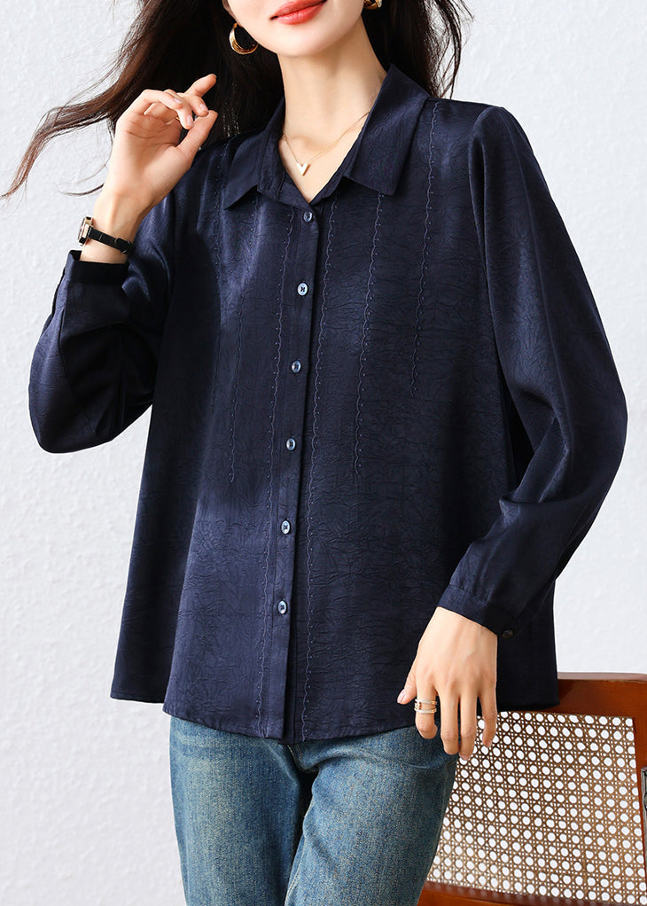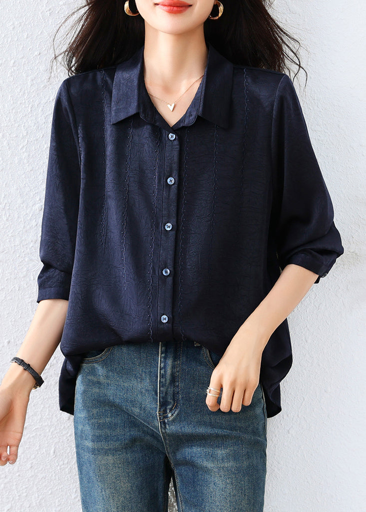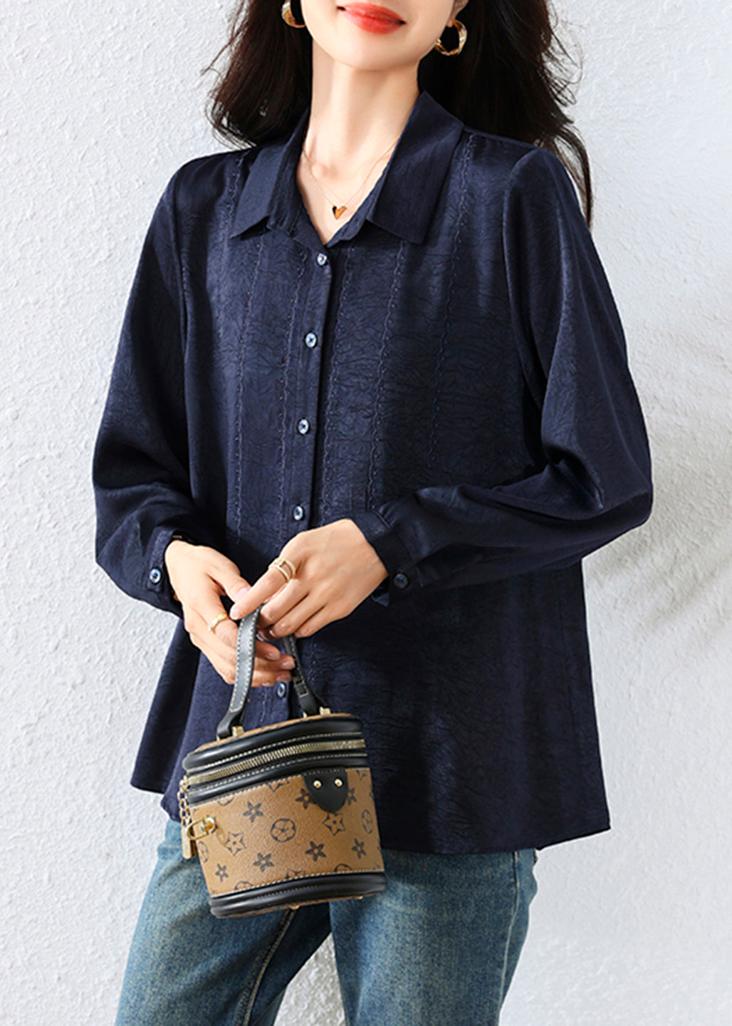 Natural Navy Peter Pan Collar Jacquard Cotton Blouse Tops Fall
