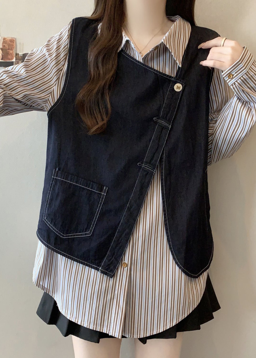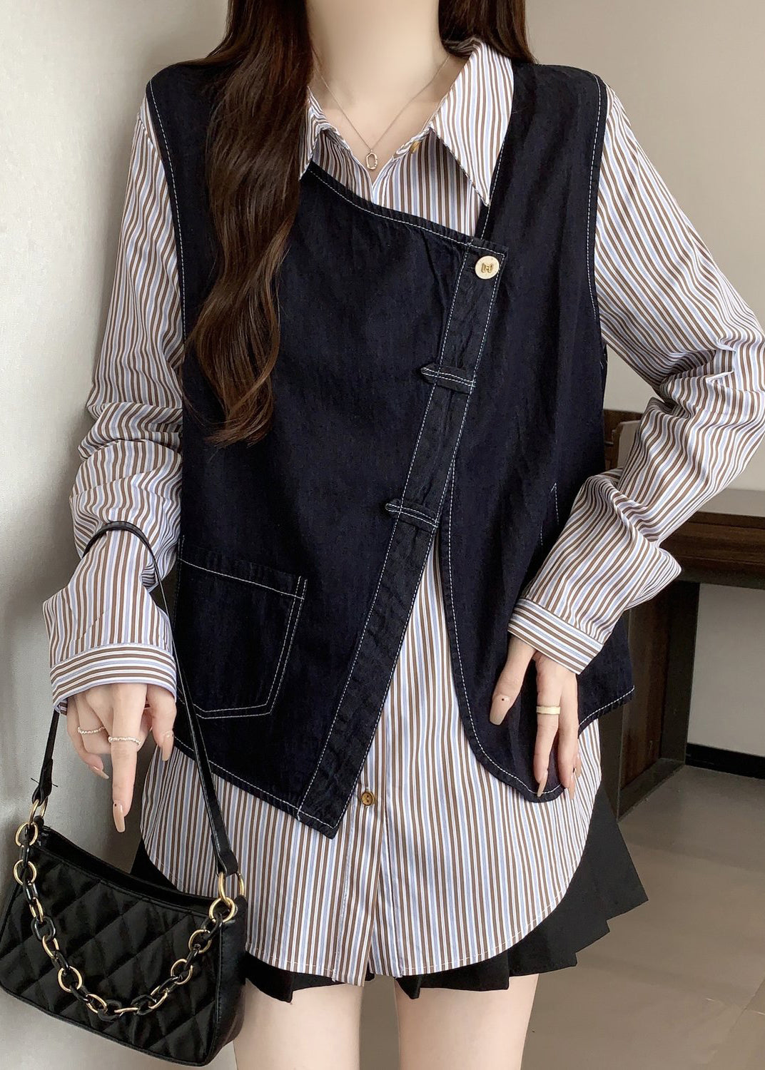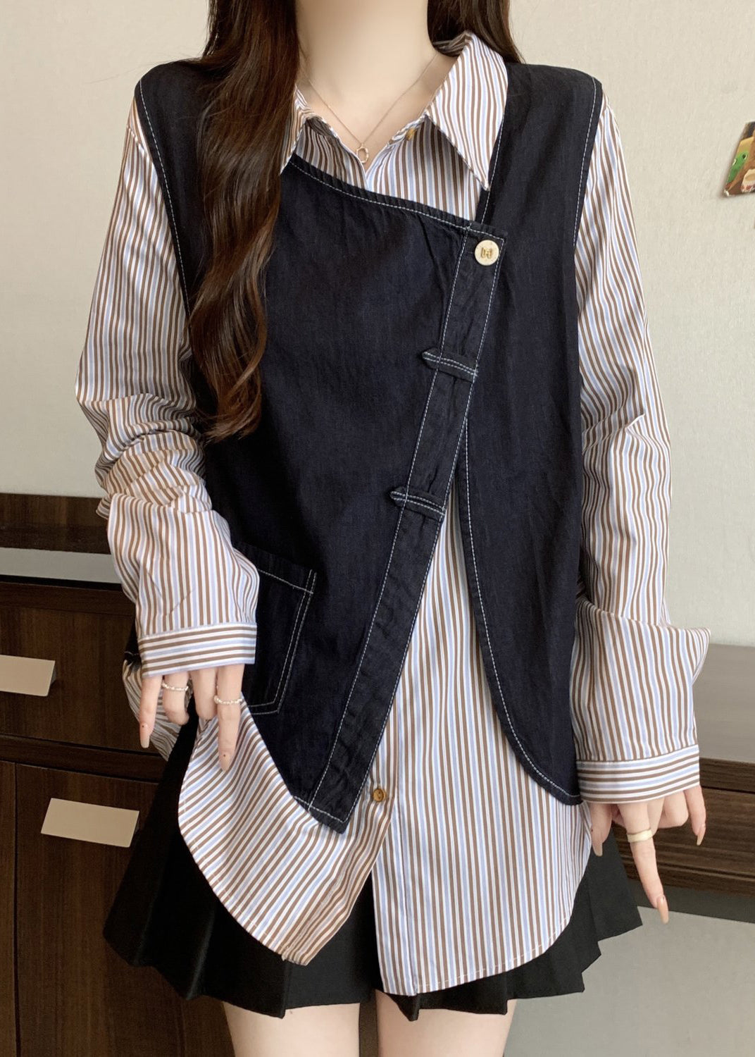 Plus Size Asymmetrical Striped Cotton Fake Two Piece Top Fall