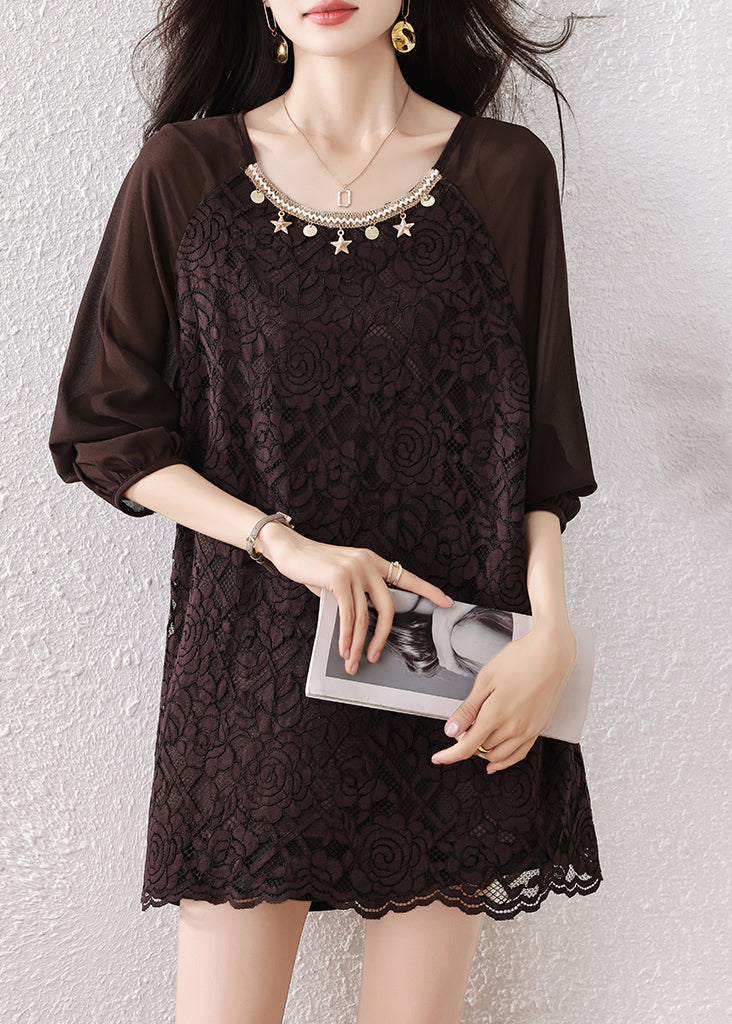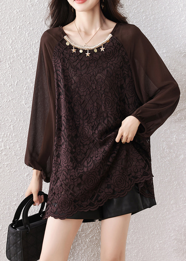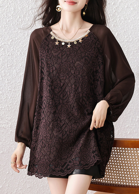 Plus Size Chocolate Oversized Star Decorated Lace Shirt Tops Fall