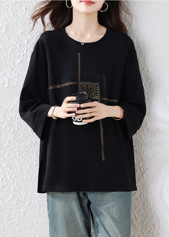 Simple Black Oversized Rhinestone Cotton Pullover Tops Fall
