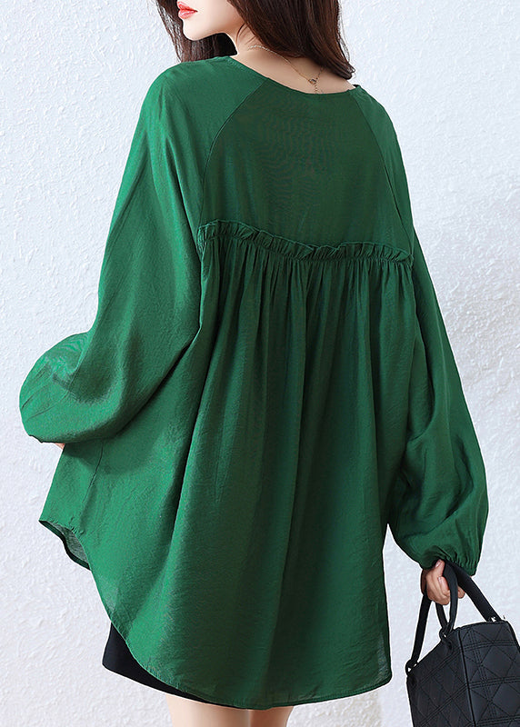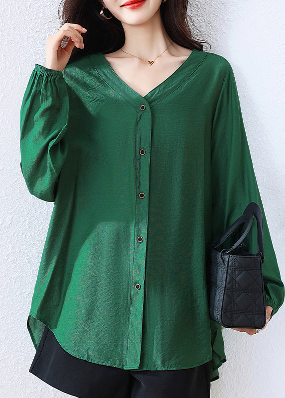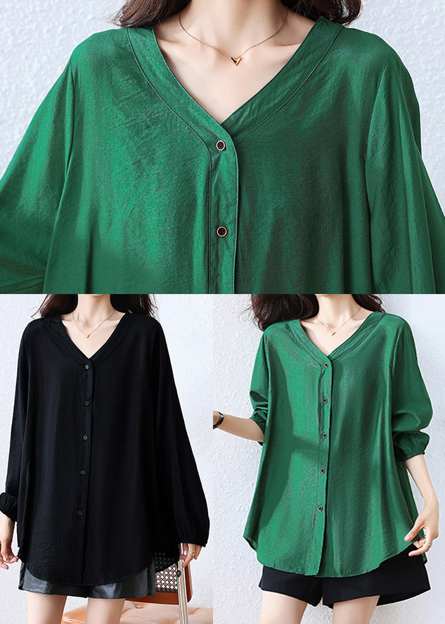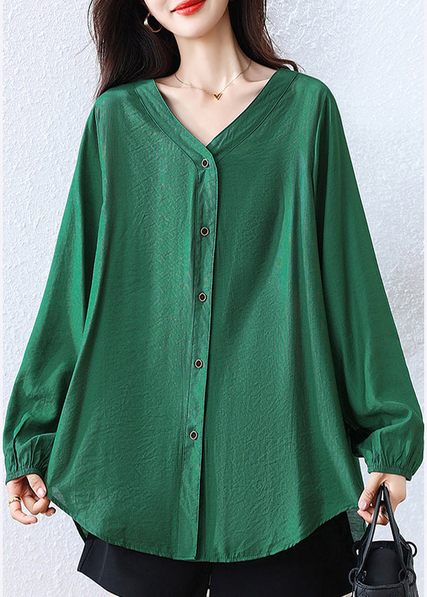 Tea Green Cotton Shirt V Neck Oversized Fall