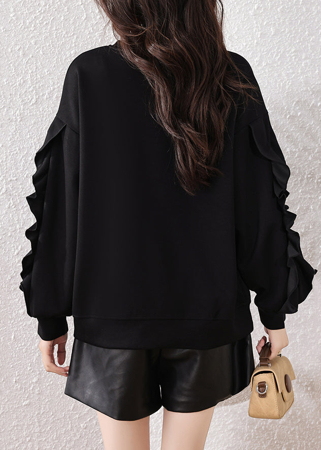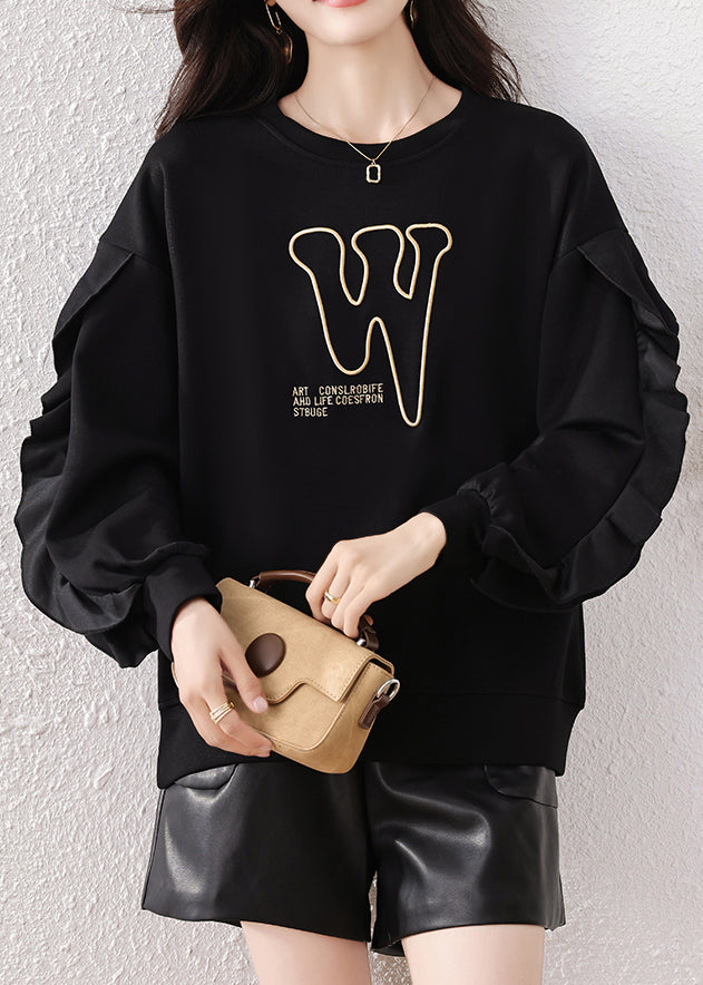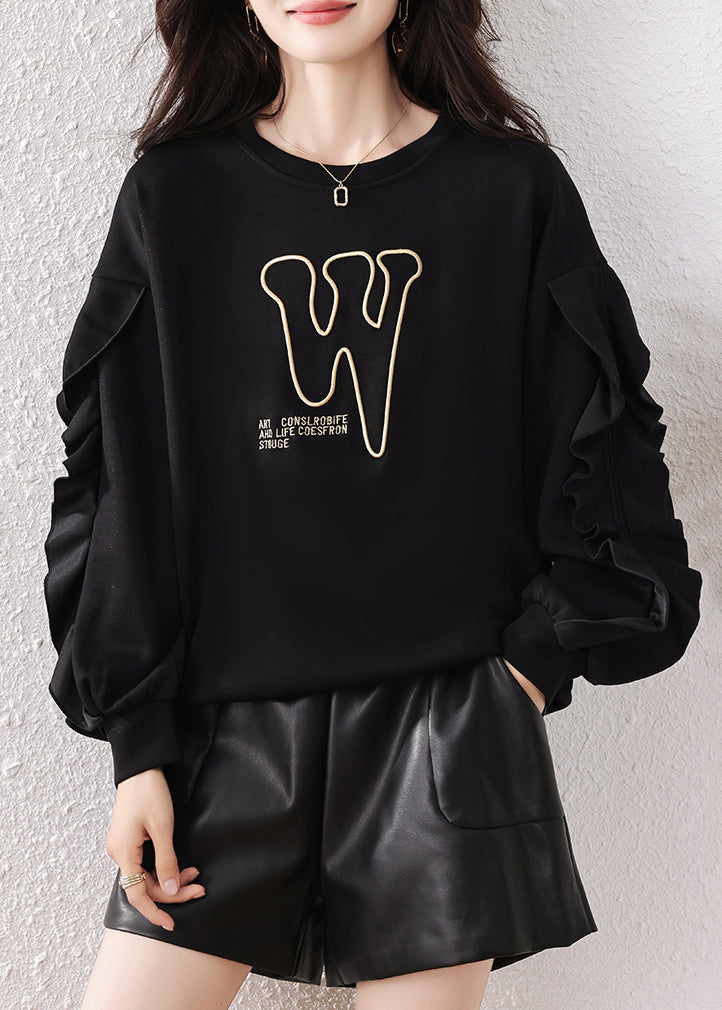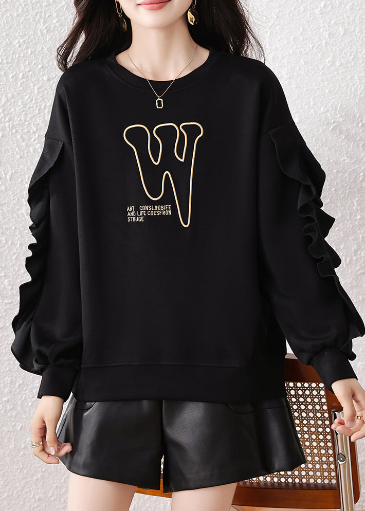 Boho Black Ruffled Embroidered Cotton Pullover Streetwear Fall