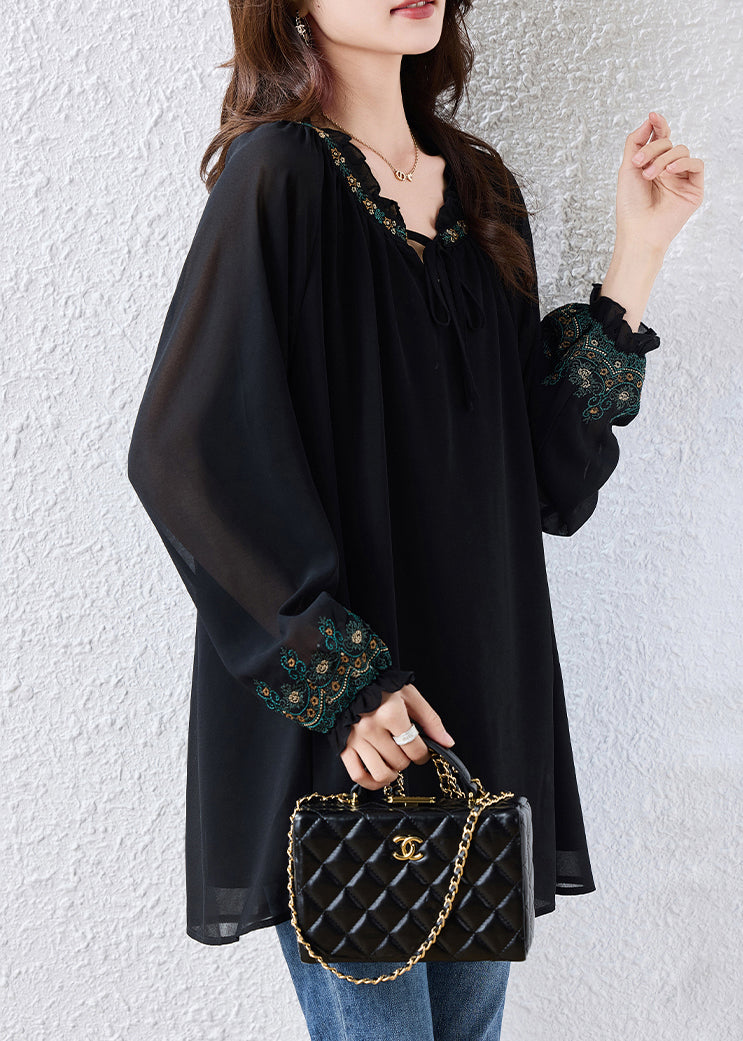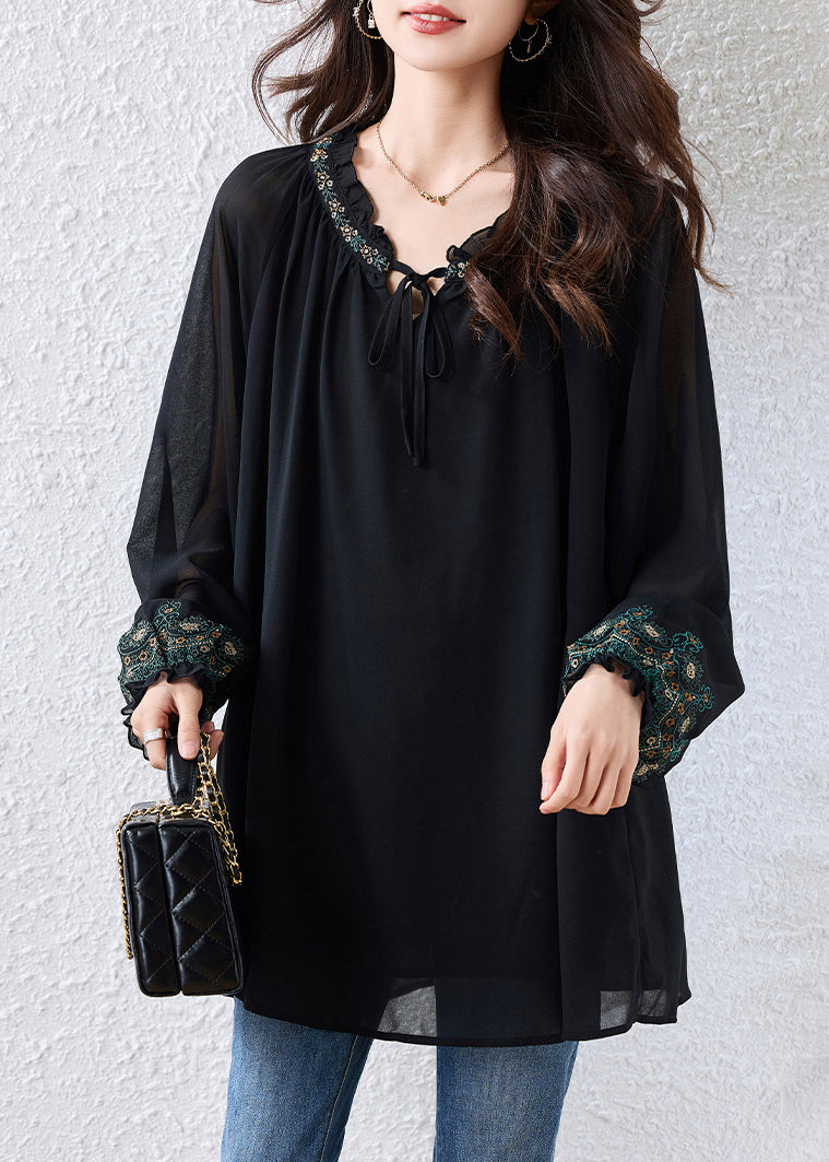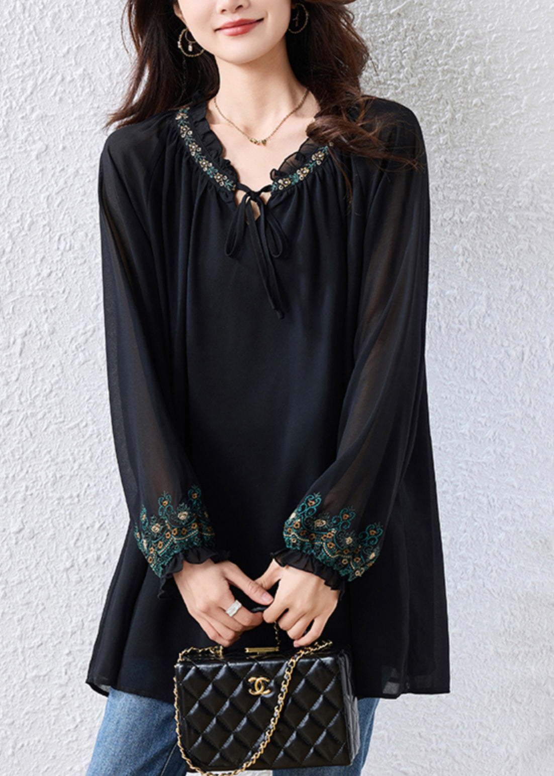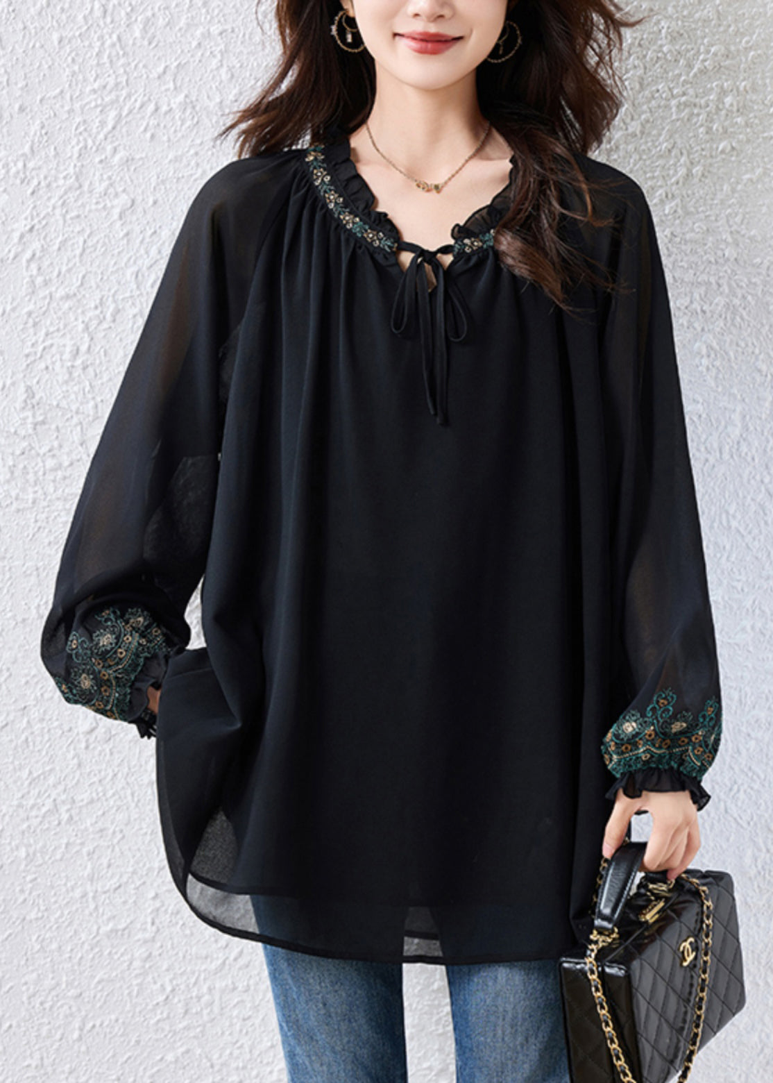 Boutique Black Embroidered Tie Neck Chiffon Blouse Tops Fall