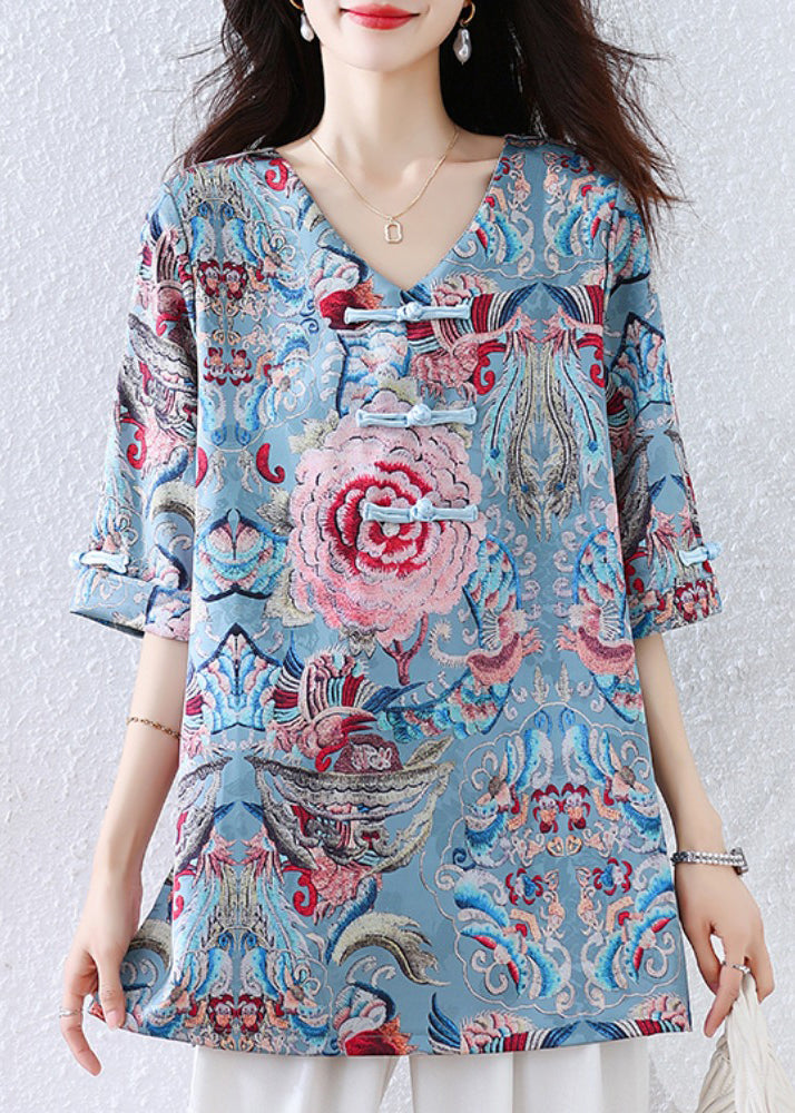 New Retro Blue Embroidered Silk Blouses Half Sleeve