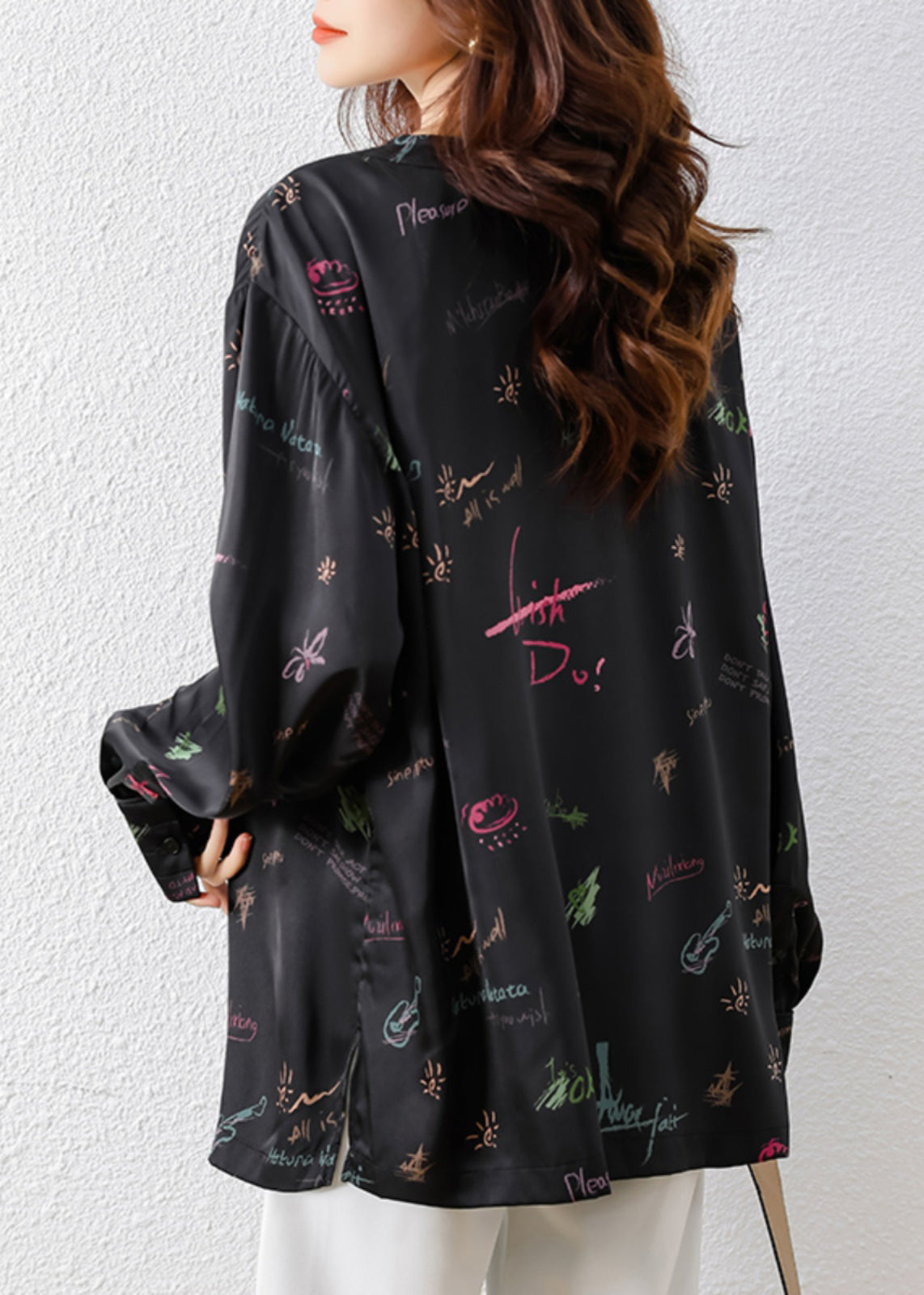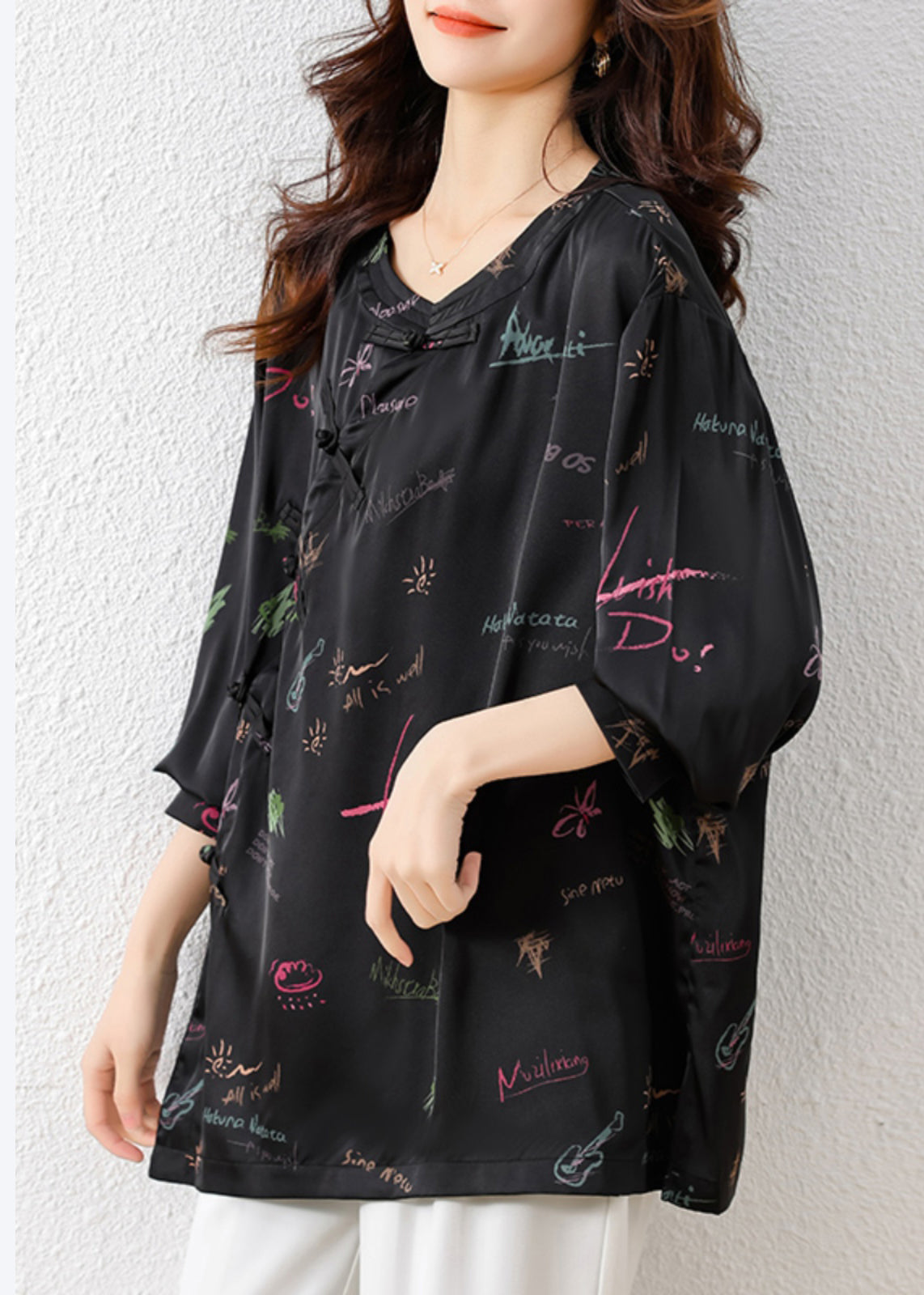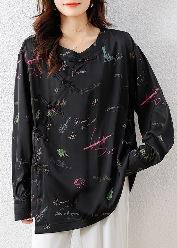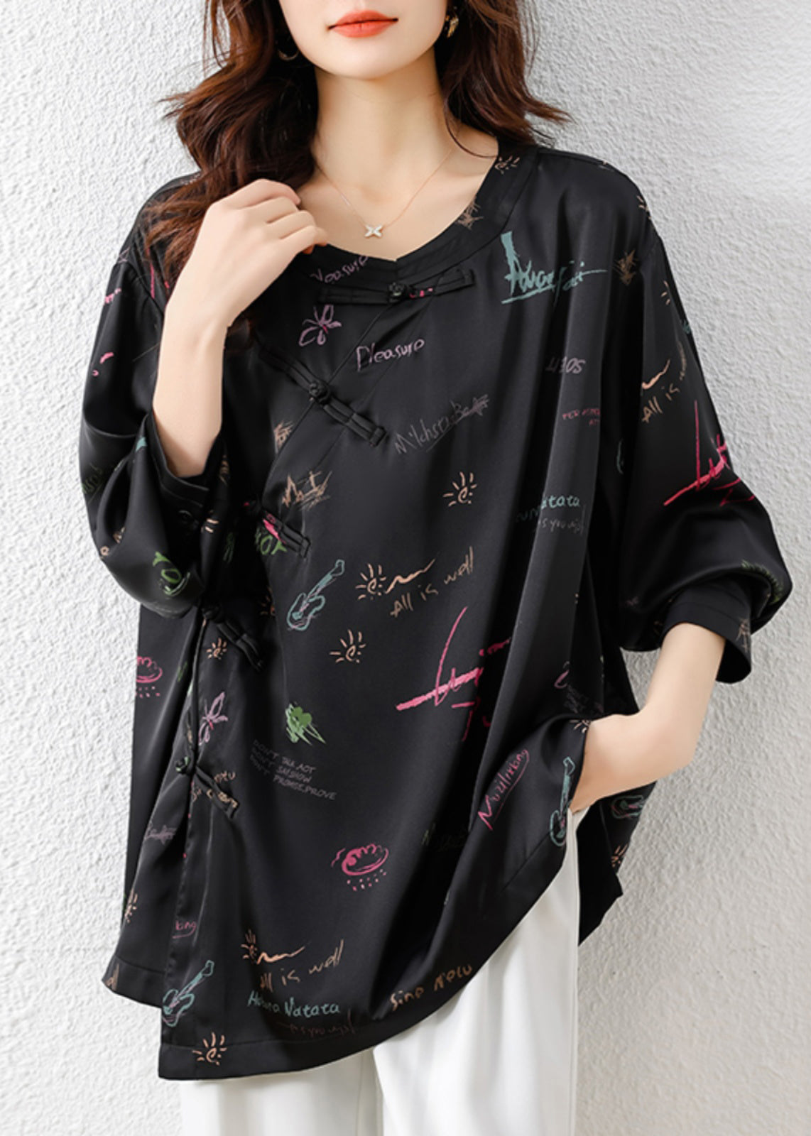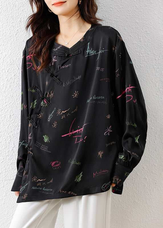 Vintage Black Embroidered Print Silk Oriental Blouses Fall