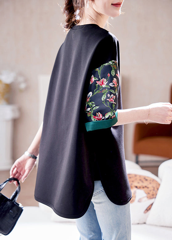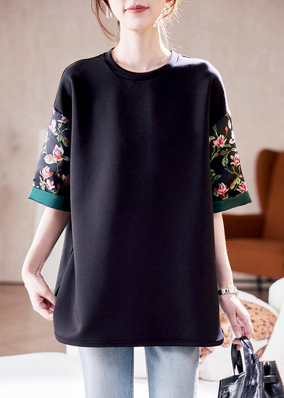 Loose Black O Neck Print Side Open Cotton T Shirts Summer