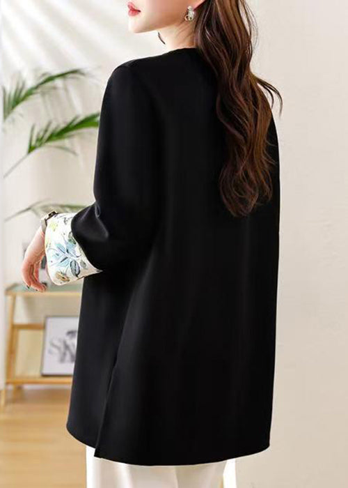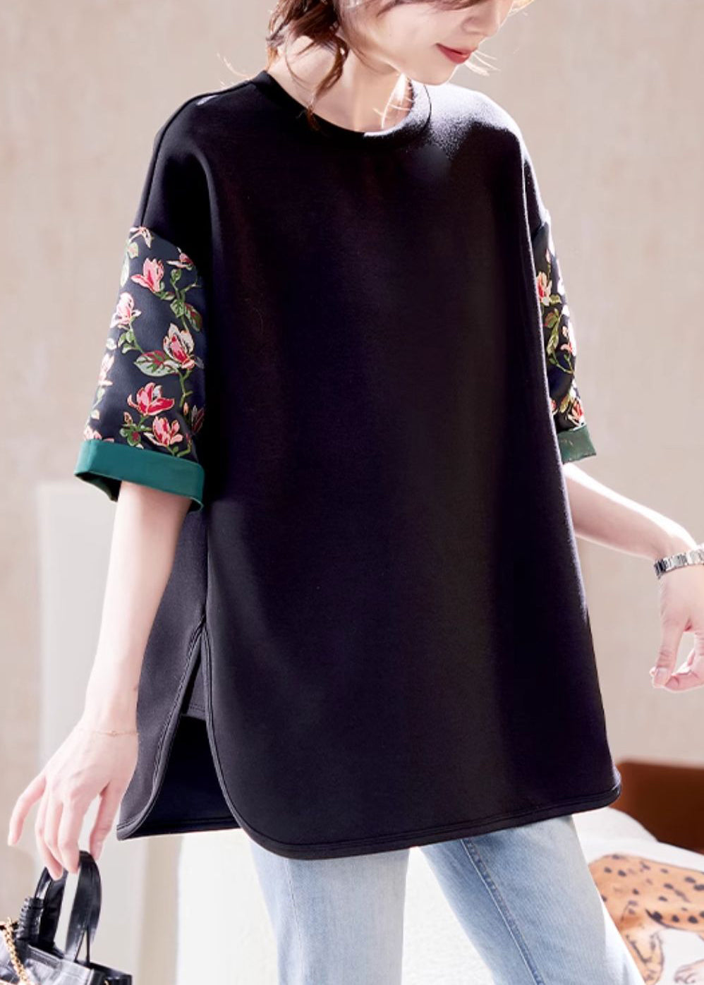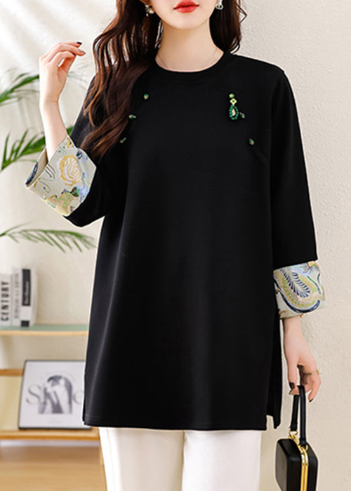 Loose Black O Neck Side Open Patchwork Cotton T Shirts Fall