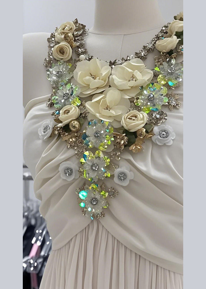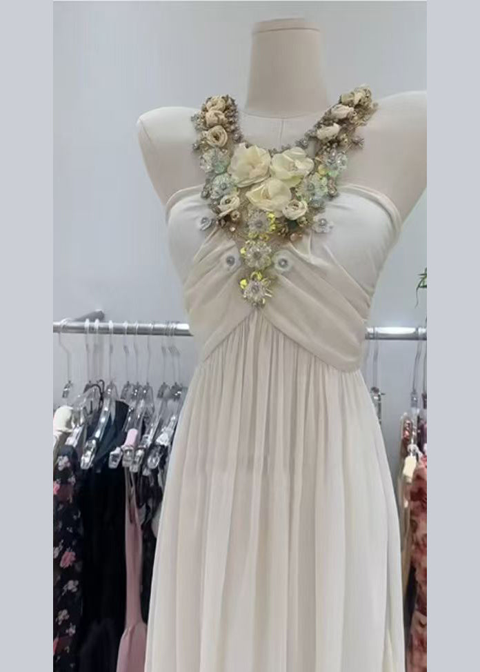 Elegant White Zircon Floral Wrinkled Patchwork Cotton Long Dress Sleeveless