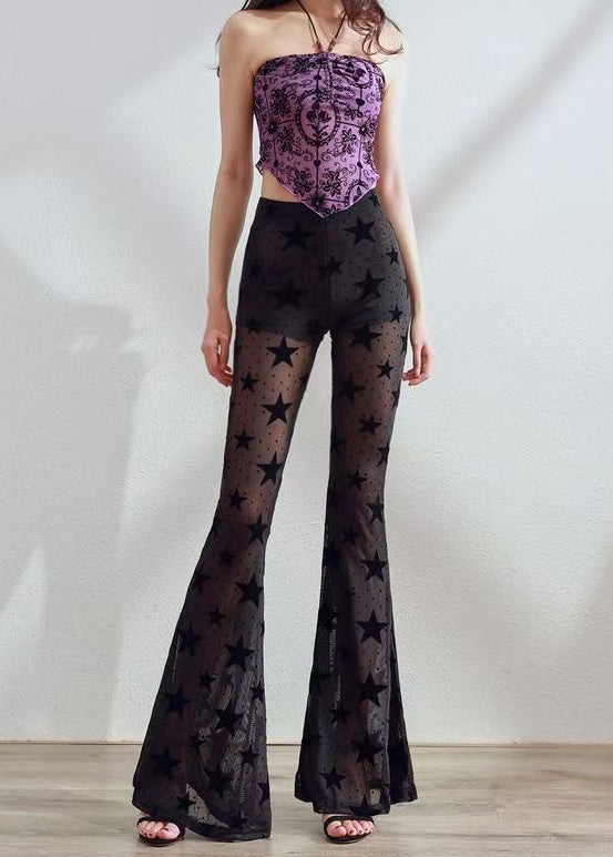 Boutique Black Star Print Hollow Out Tulle Flare Bottoms Pants Fall