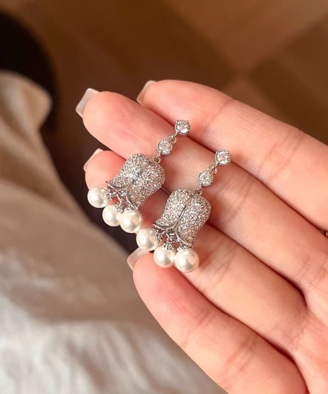 French Gold Copper Overgild Zircon Pearl Lily Of The Valley Drop Earrings