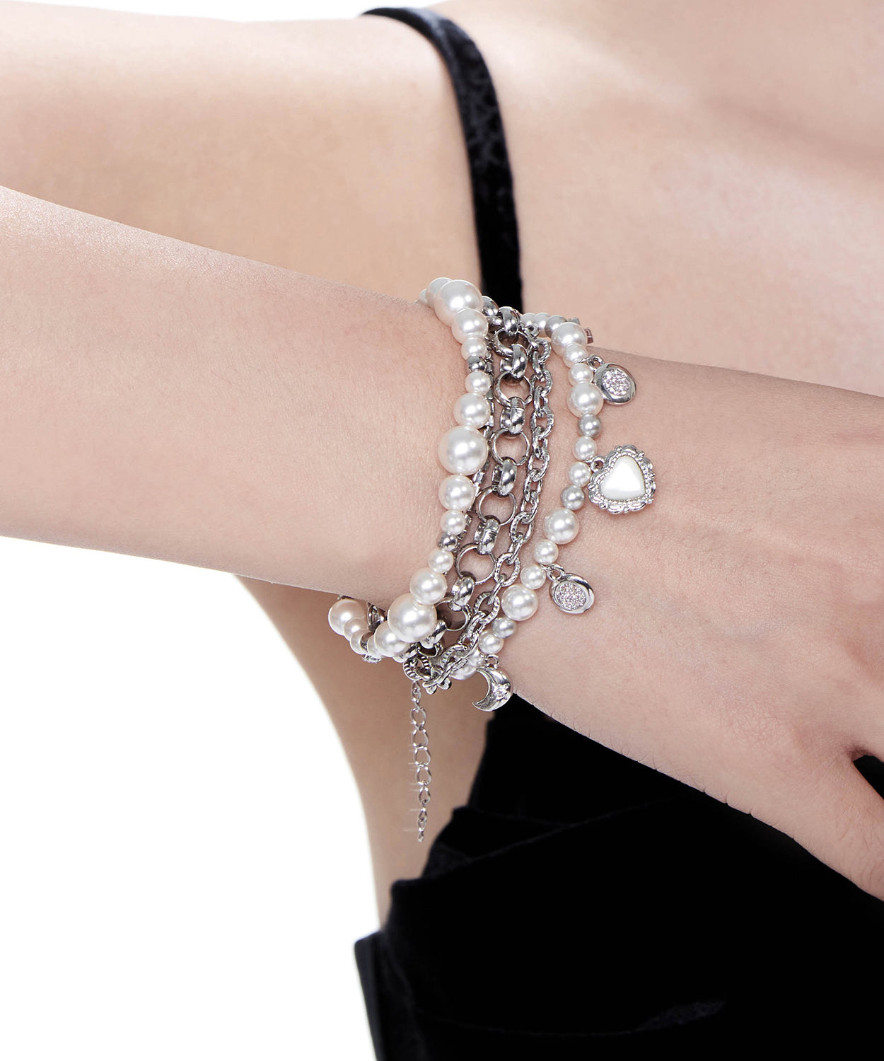 Unique White Pearl Love Heart Pendant Multi Layered Alloy Bracelet