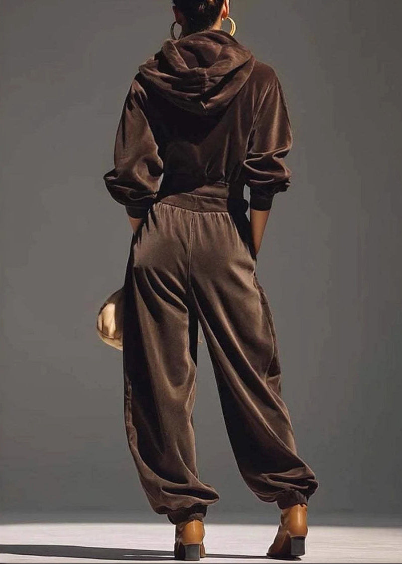 Women Coffee Hooded Pockets Sweatshirt And Pants Silk Velvet Two Pieces Set Spring