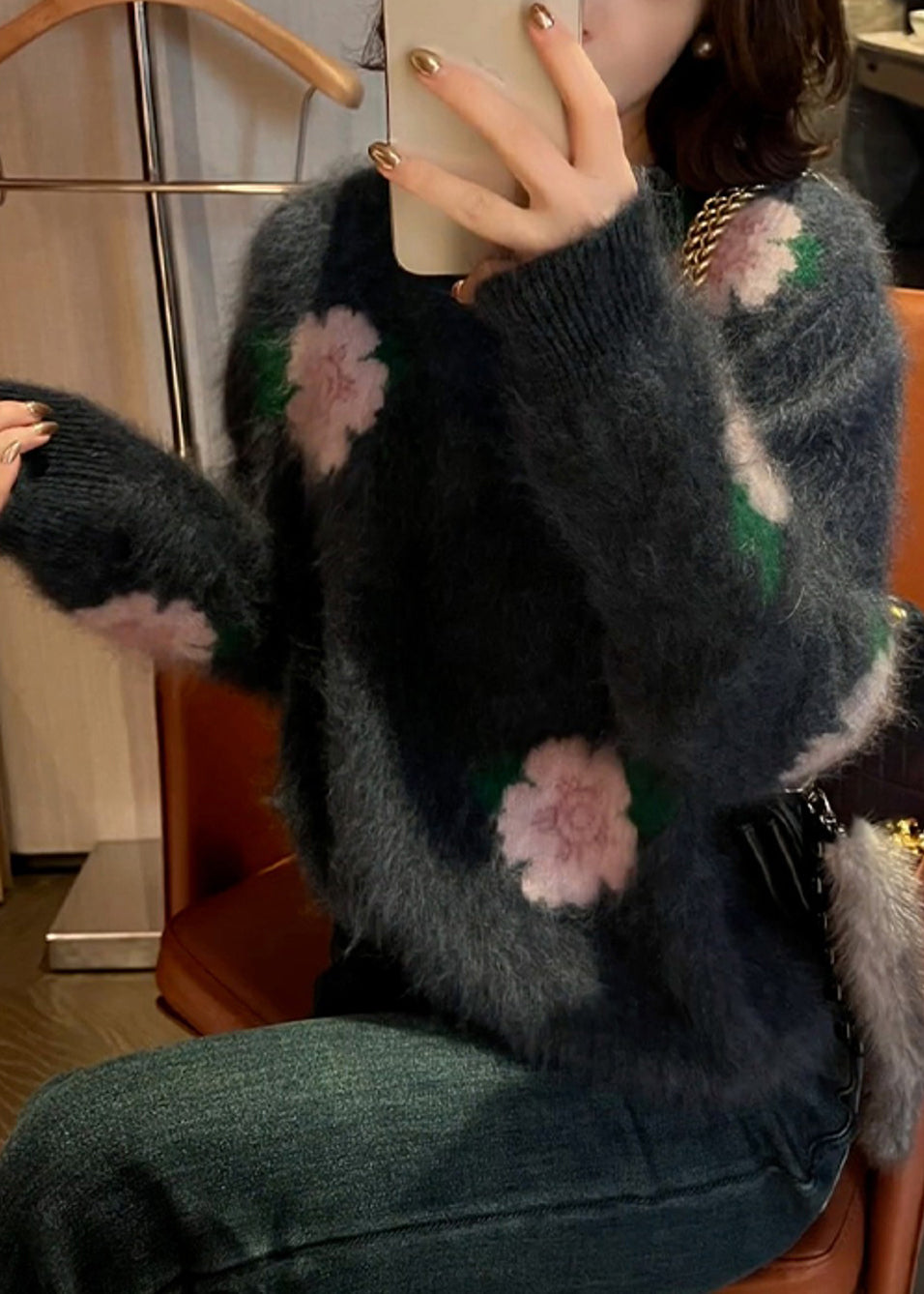 French Dark Grey Oversized Floral Ma Hai mao Knit Sweater Tops Winter