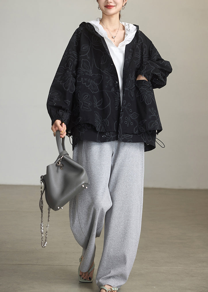 Natural Black Embroidered Cotton Hoodies Outwear Spring