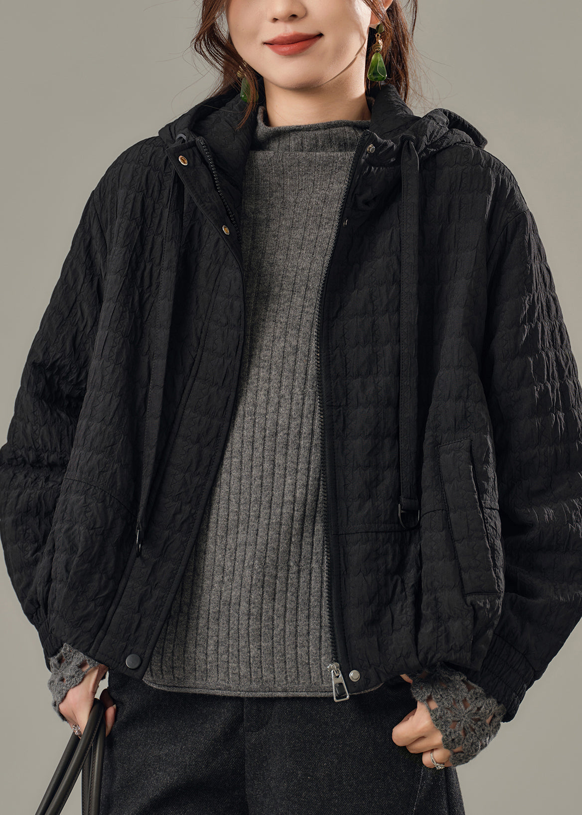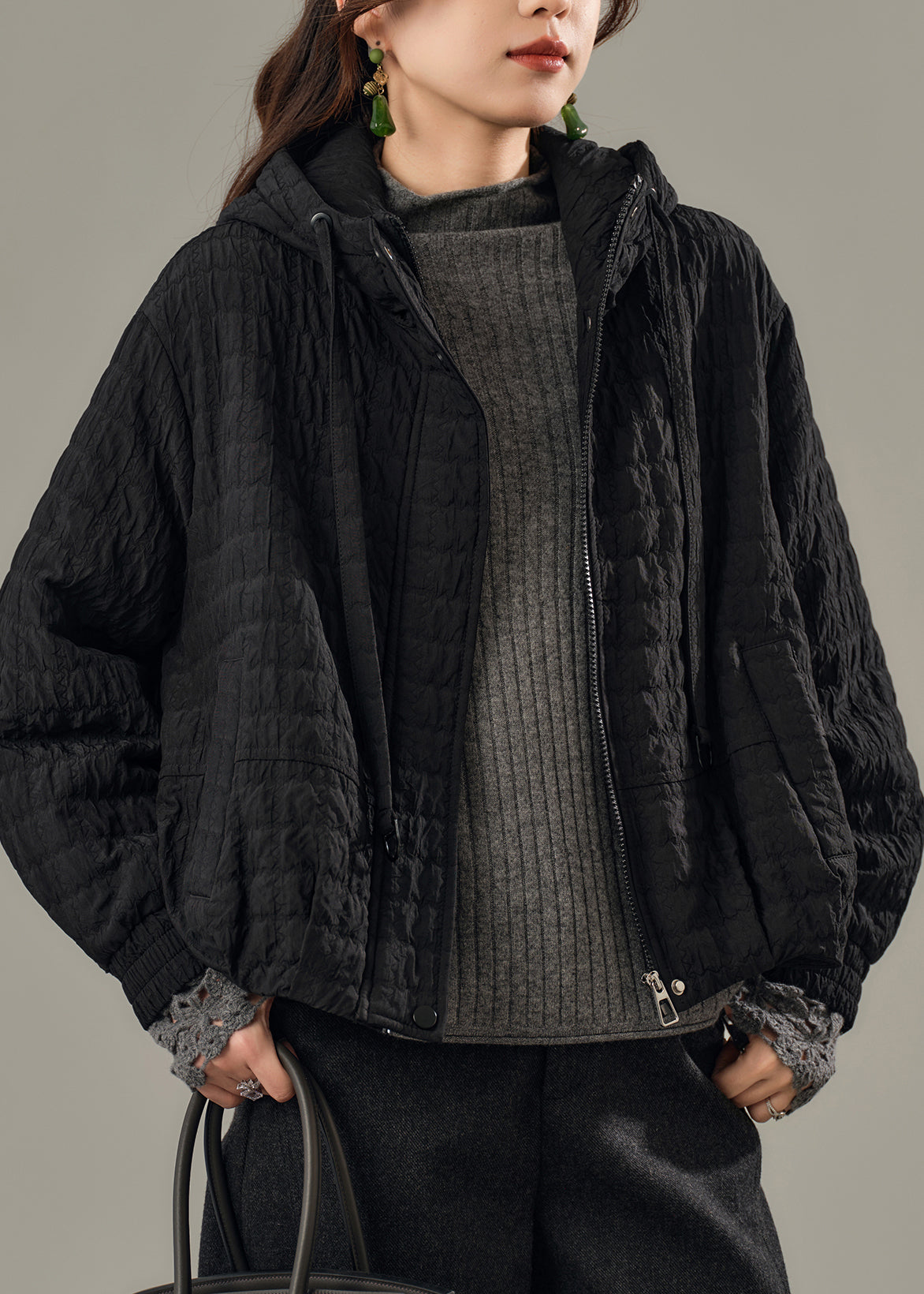 French Black Oversized Patchwork Fine Cotton Filled Hooded Coat Winter