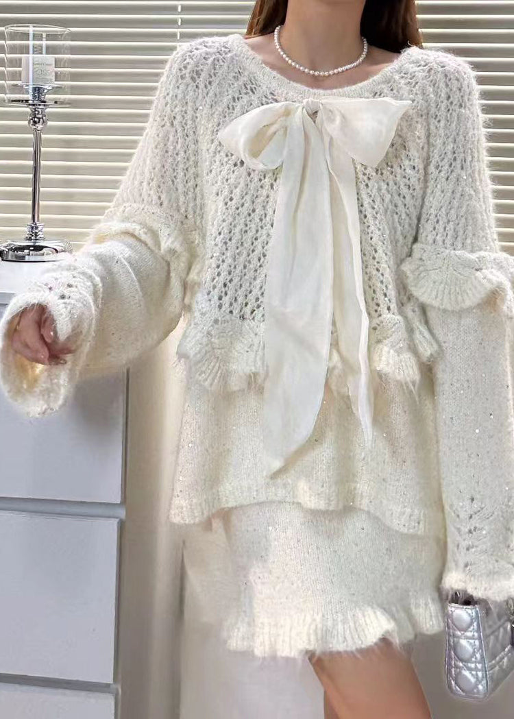Chic Purple Ruffled Hollow Out Bow Knit Two Piece Set Winter