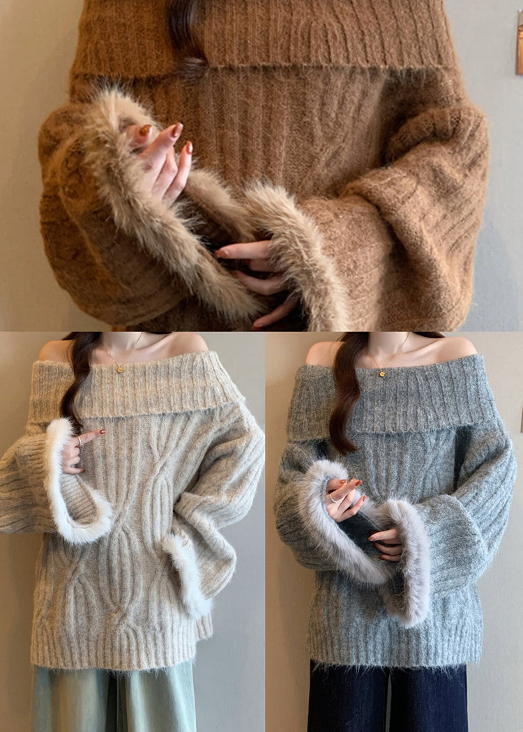 Grey Patchwork Faux Fur Sweater Tops Cold Shoulder Winter