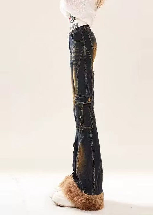 Silm Fit Navy Patchwork Pockets Faux Fur Denim Flare Bottoms Spring
