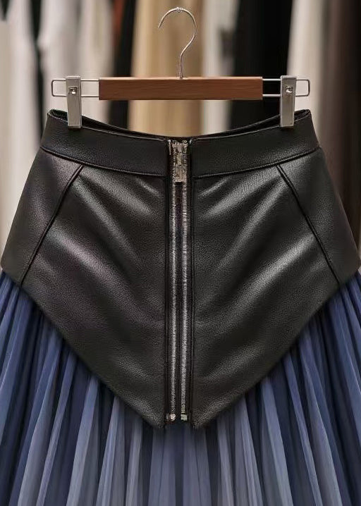 Black Zippered Tulle Patchwork Faux Leather Skirts Wrinkled