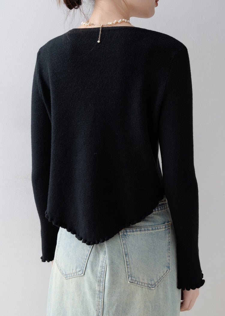 French Black O Neck Floral Ruffled Knitted Tops Spring