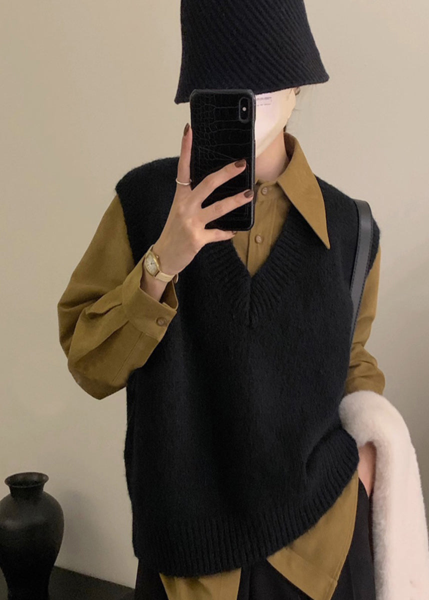 Fashion Black V Neck Geometric Print Knit Vest Sleeveless
