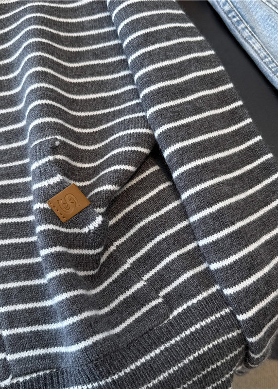 Casual Grey Zip Up Striped Hooded Knit Coats Spring