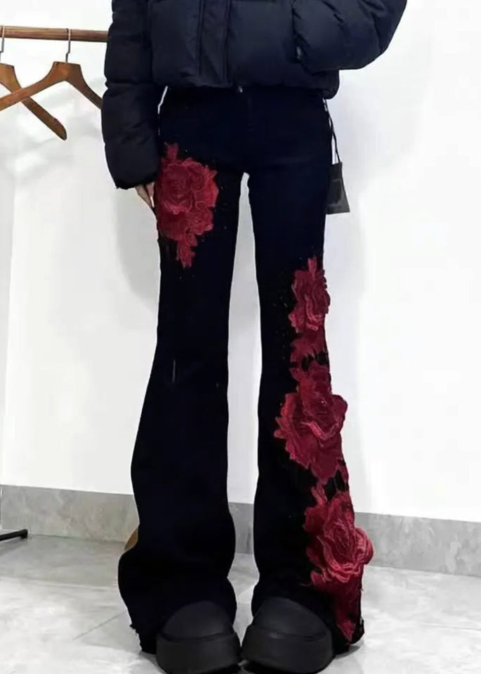Slim Fit Black High Waist Roses Patchwork Denim Flare Bottoms Spring