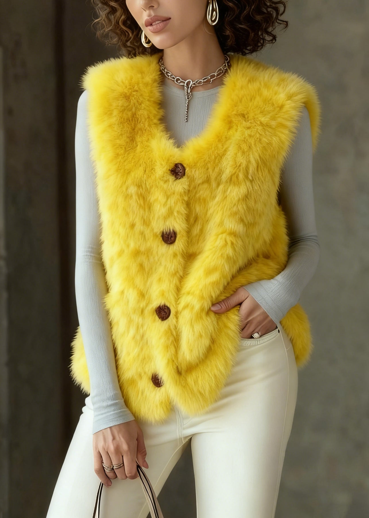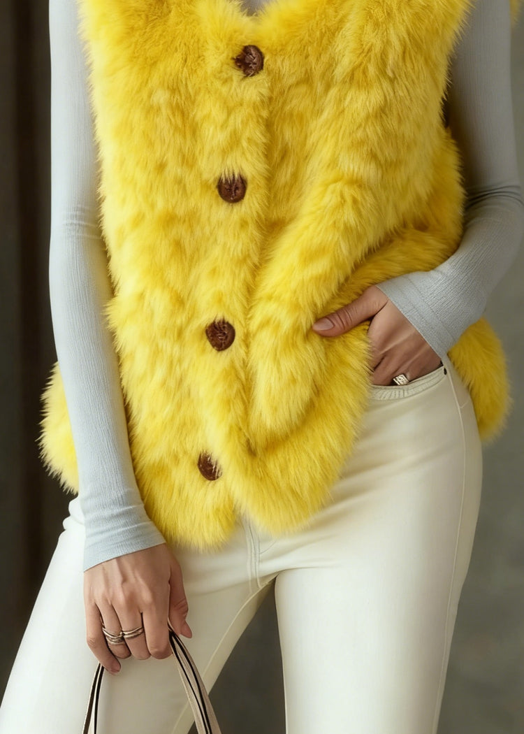 Beautiful Yellow Button Faux Fur Vest Tops Sleeveless
