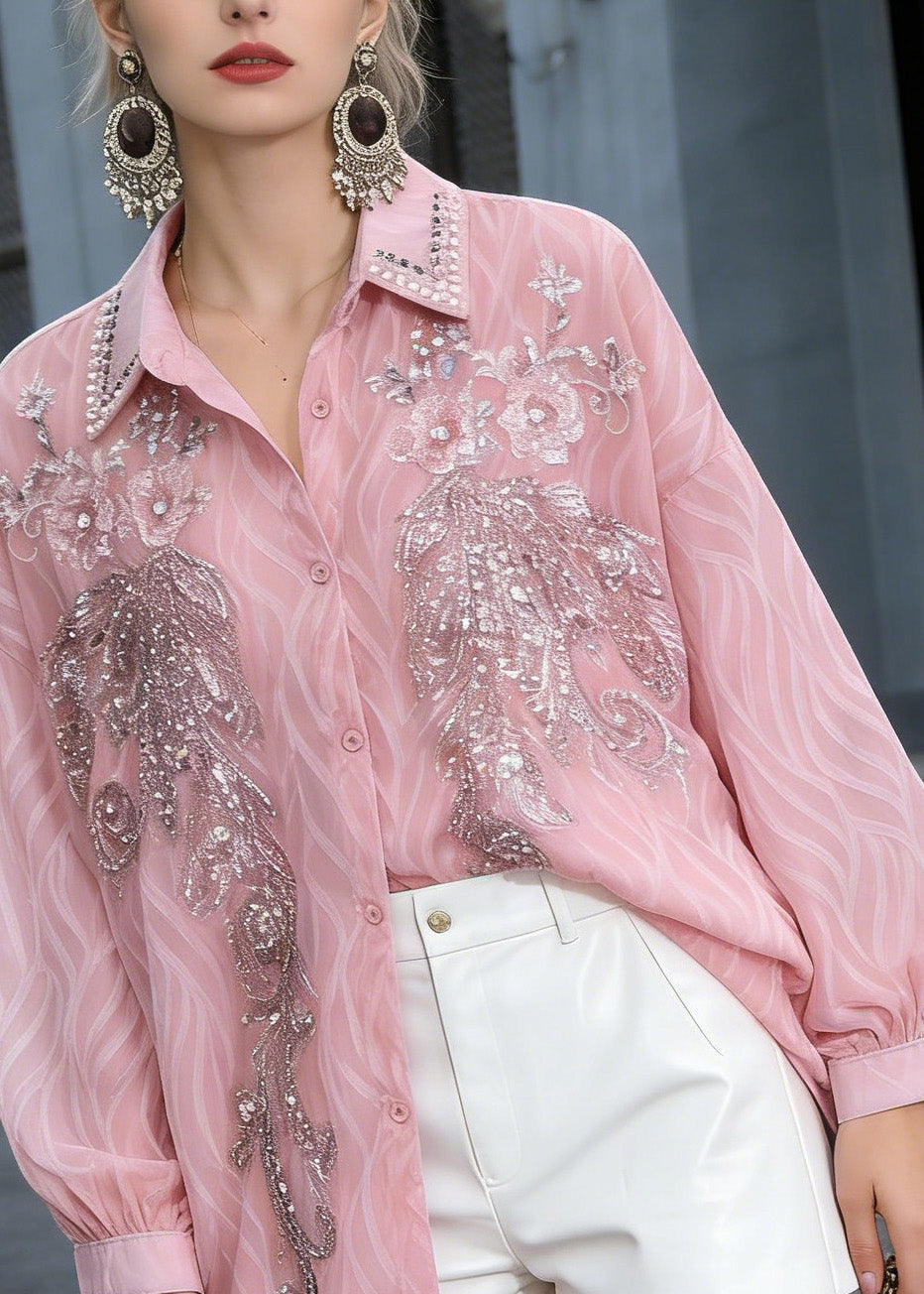 New Pink Peter Pan Collar Nail Bead Sequins Shirts Spring